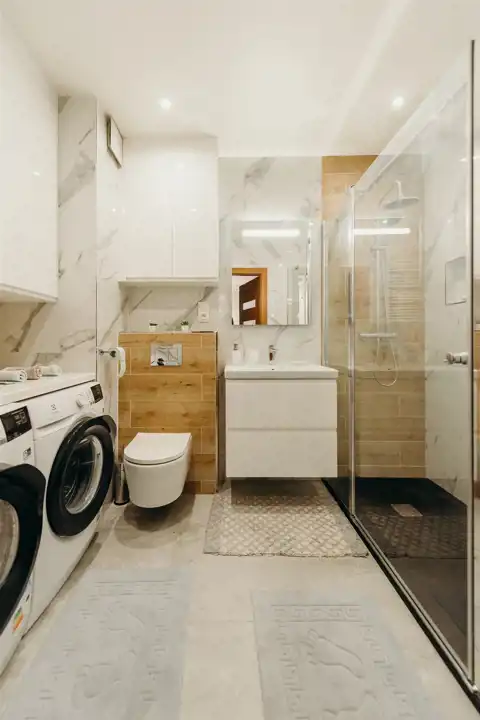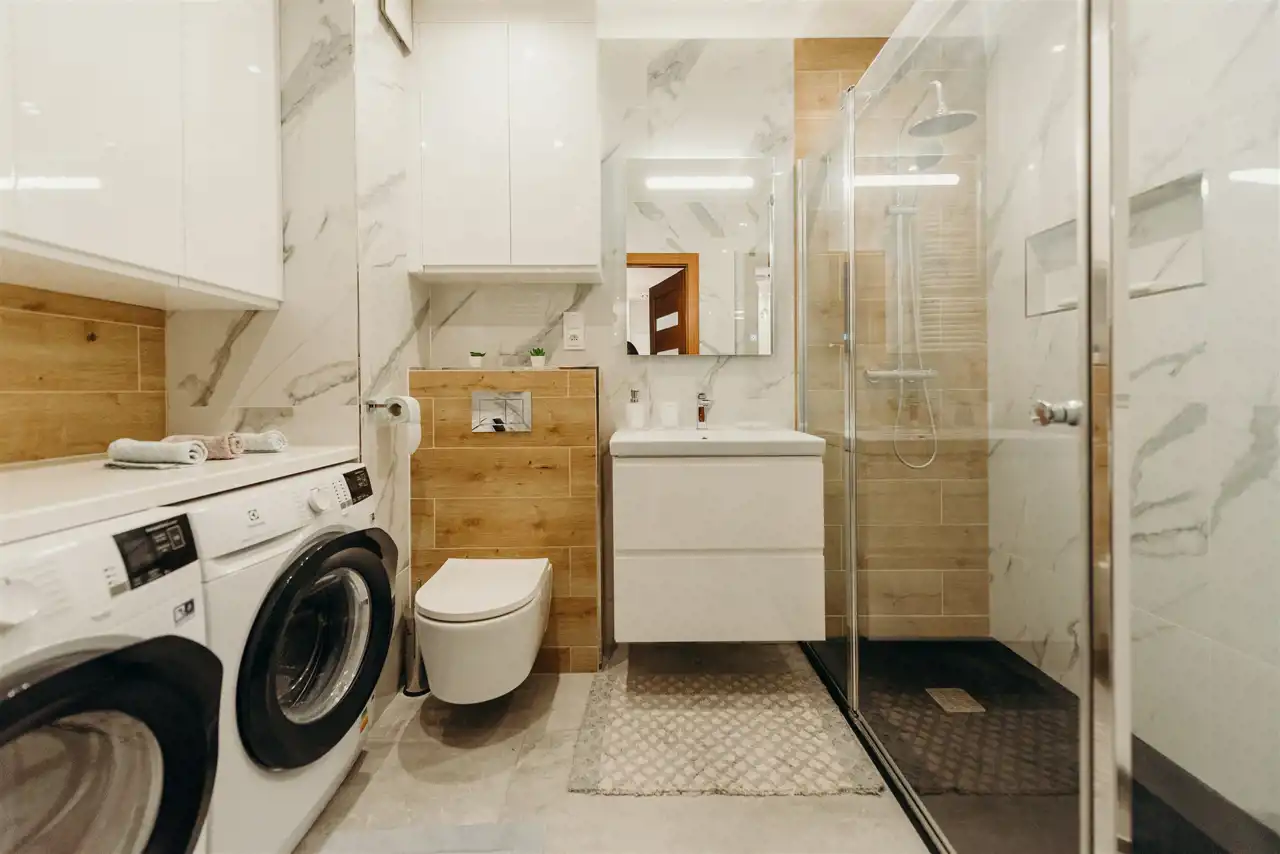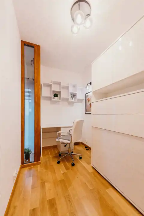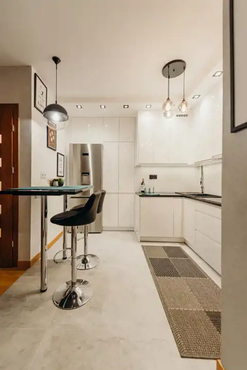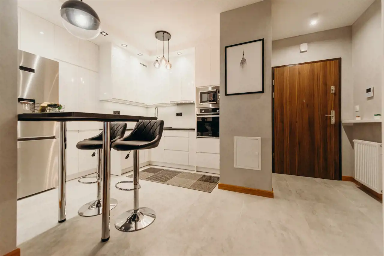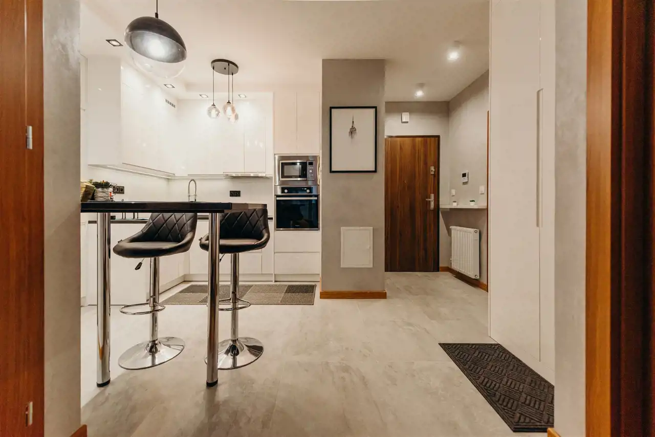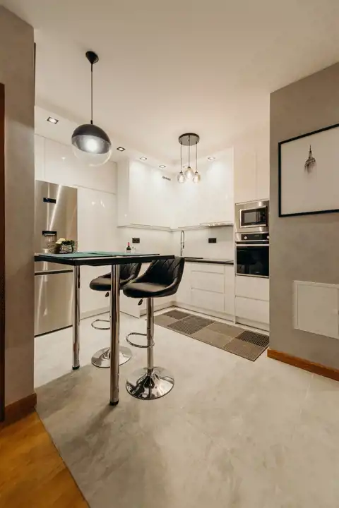 - kuchnia w zabudowie, wyposażona we wszystkie niezbędne sprzęty AGD (zabudowana lodówka, piekarnik, płyta indukcyjna, zmywarka, okap)