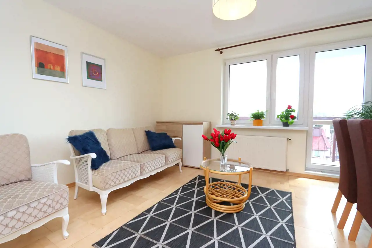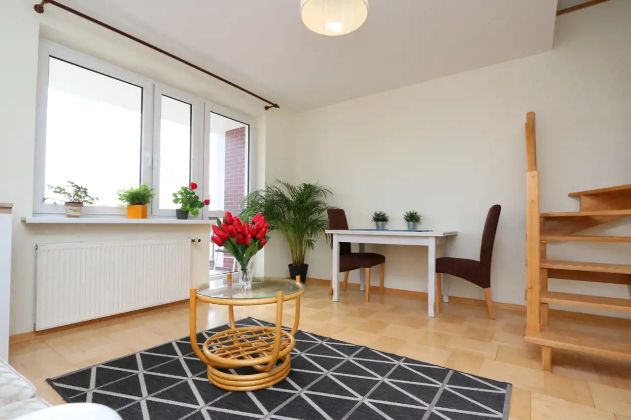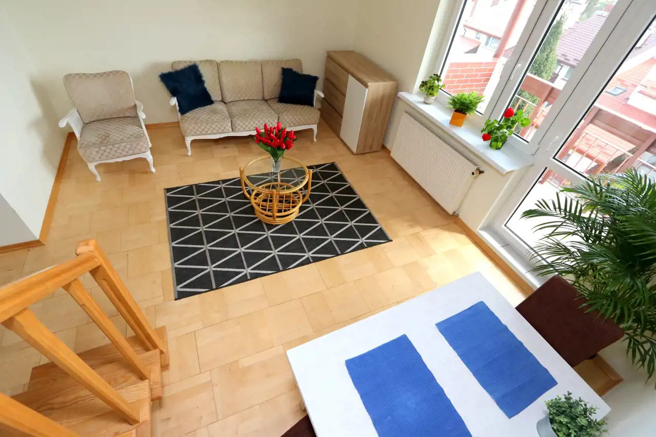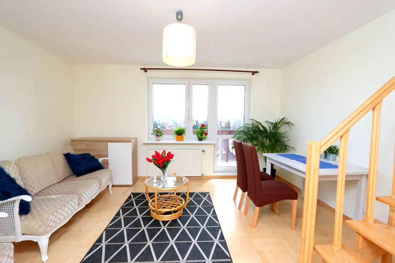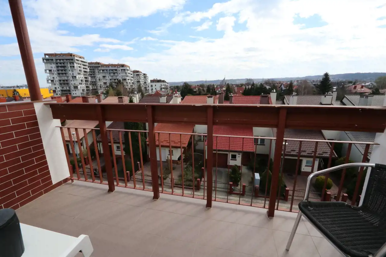 Bardzo przestrzenne i jasne mieszkanie z pięknym widokiem na panoramę miasta. Mieszkanie składające się z kuchni z jadalnią, małego pokoju, który może być użytkowany przez dziecko, bądź będzie to idealny gabinet. Z przestrzennego salonu prowadzą drewniane schody do kolejnego dużego pokoju z garderobą. Łazienka jest dosyć duża, bez problemu można wstawić pralkę, posiada wannę. Do dyspozycji nowego właściciela będzie także balkon o powierzchni 3m2 oraz piwnica o powierzchni prawie 5m2. Mieszkanie sprzedawane jest z zabudową stałą. Pod blokiem znajduje się spory parking za szlabanem.