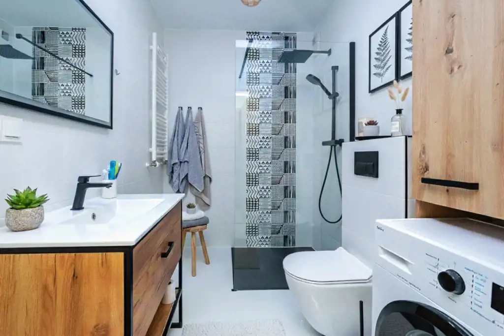 łazienka z prysznicem oraz pralką