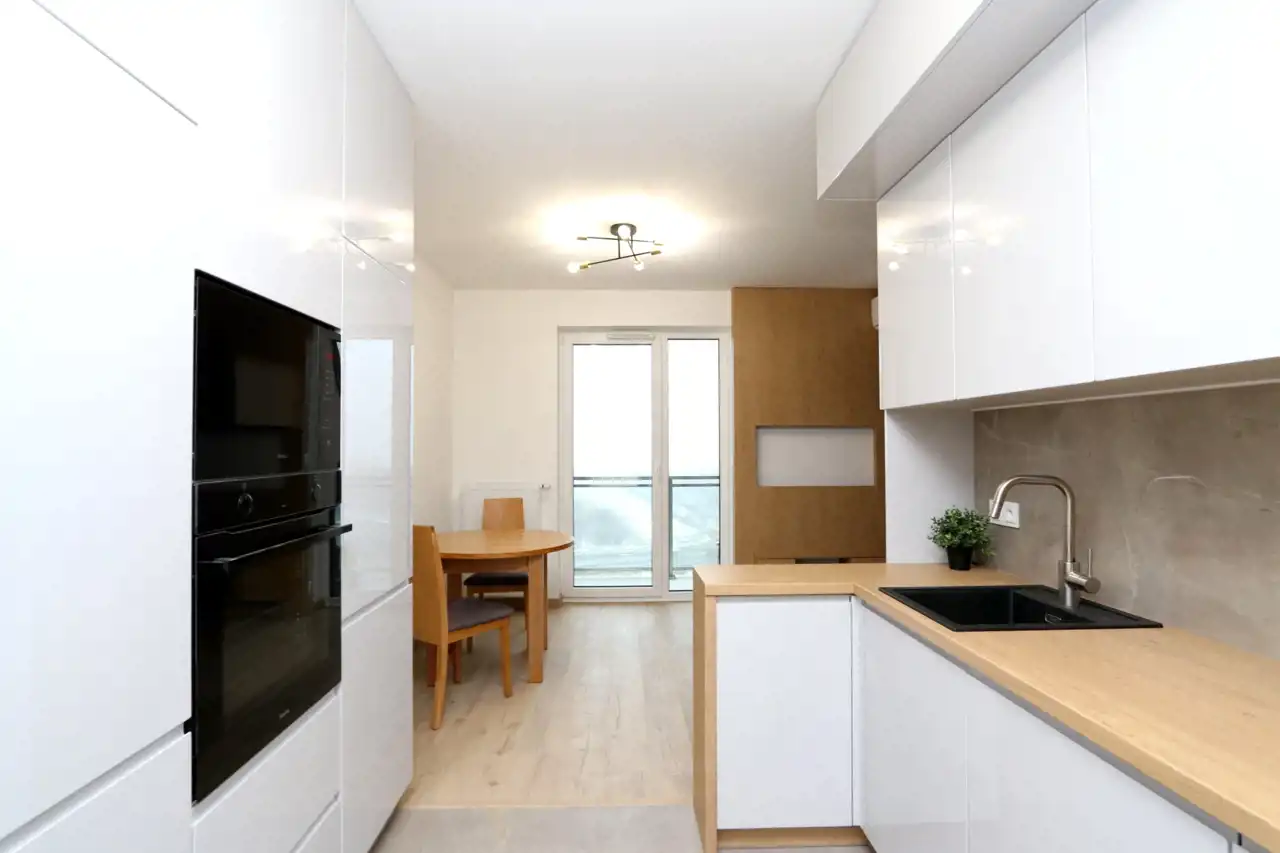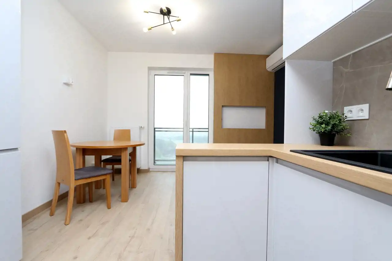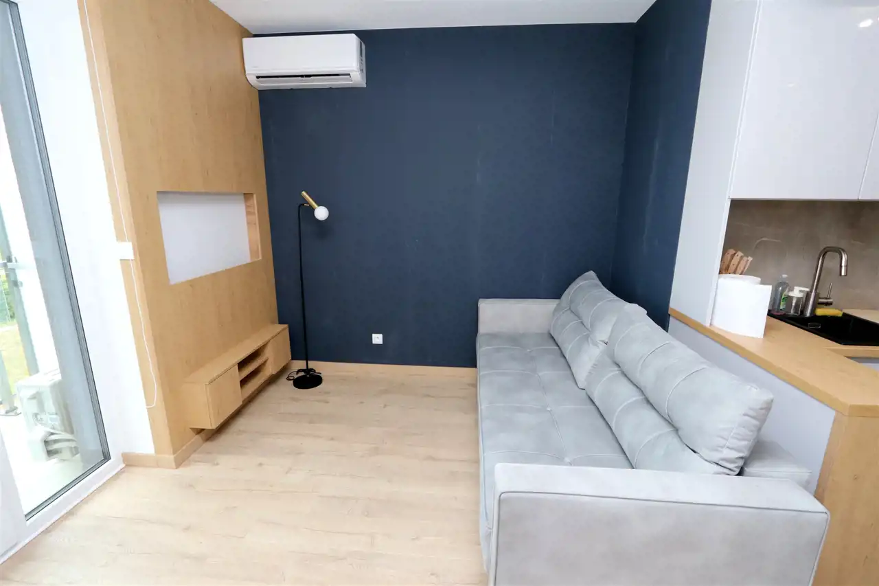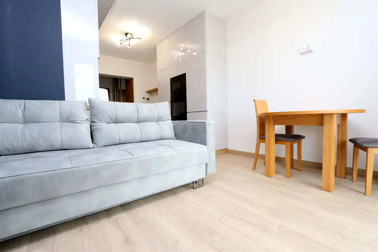 Mieszkanie wykończone jest w wysokim standardzie, zastosowane zostały przemyślane rozwiązania aby przestrzeń była jak najlepiej wykorzystana. Salon wyposażony jest w piękną stalowo- srebrną rozkładaną kanapę. Jest już także telewizor na wyposażeniu. Kuchnia posiada wszystkie niezbędne sprzęty takie jak płyta indukcyjna, piekarnik, mikrofala w zabudowie, zmywarka, a także sprzęty codziennego użytku jak zastawa kuchenna, dobrej jakości garnki czy sztućce. W łazience znajduje się wanna z szyba prysznicową, dużo szafek oraz dla wygody została umieszczona pralko-suszarka.