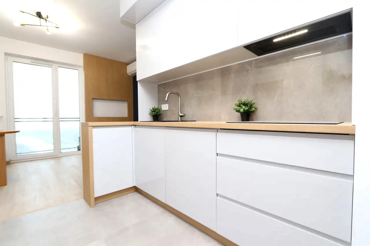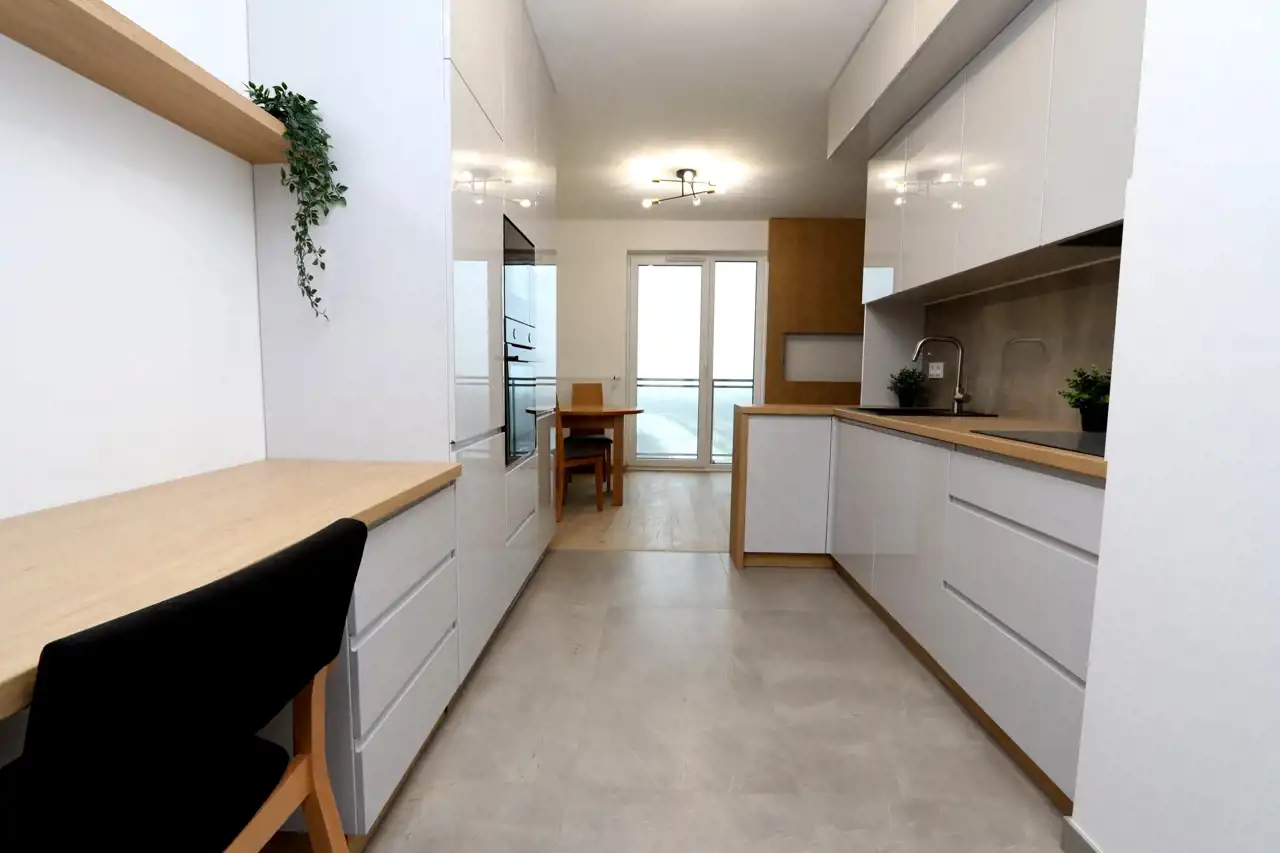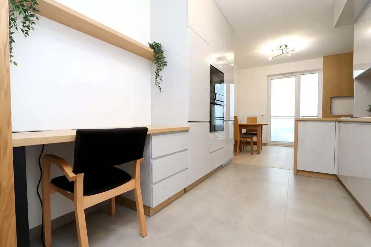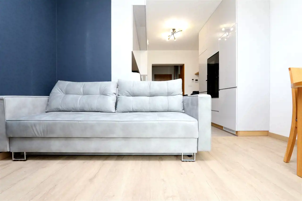 Mieszkanie wykończone jest w wysokim standardzie, zastosowane zostały przemyślane rozwiązania aby przestrzeń była jak najlepiej wykorzystana. Salon wyposażony jest w piękną stalowo- srebrną rozkładaną kanapę. Jest już także telewizor na wyposażeniu. Kuchnia posiada wszystkie niezbędne sprzęty takie jak płyta indukcyjna, piekarnik, mikrofala w zabudowie, zmywarka, a także sprzęty codziennego użytku jak zastawa kuchenna, dobrej jakości garnki czy sztućce. W łazience znajduje się wanna z szyba prysznicową, dużo szafek oraz dla wygody została umieszczona pralko-suszarka.