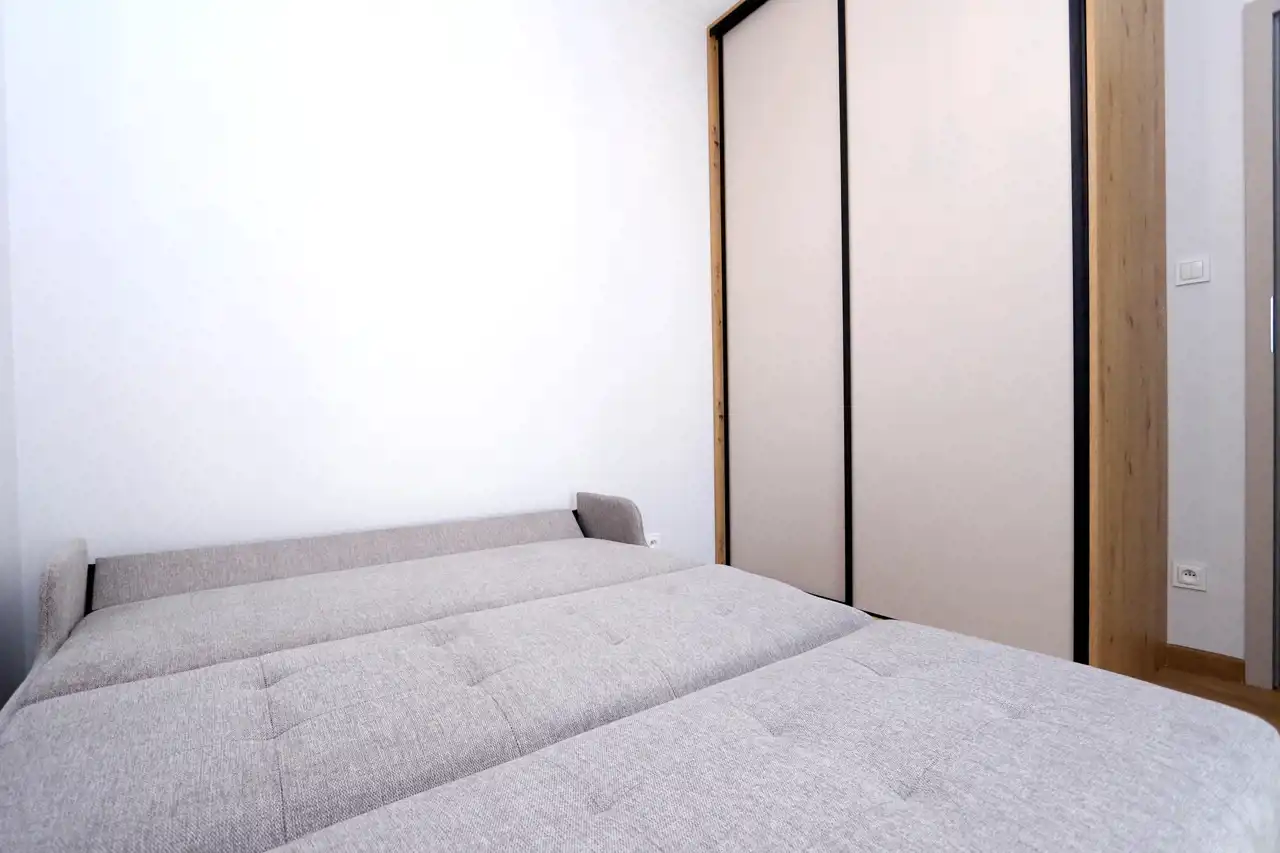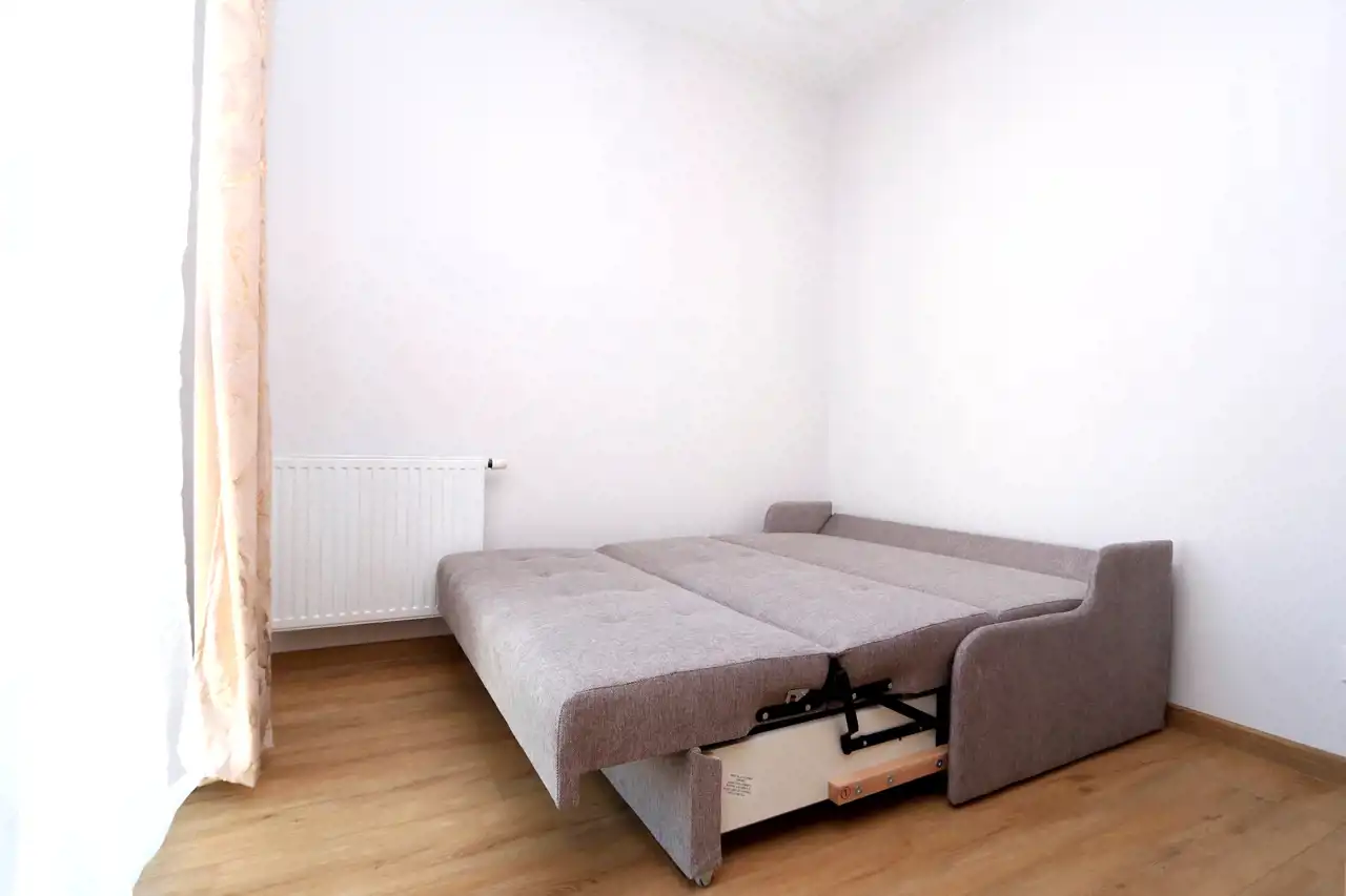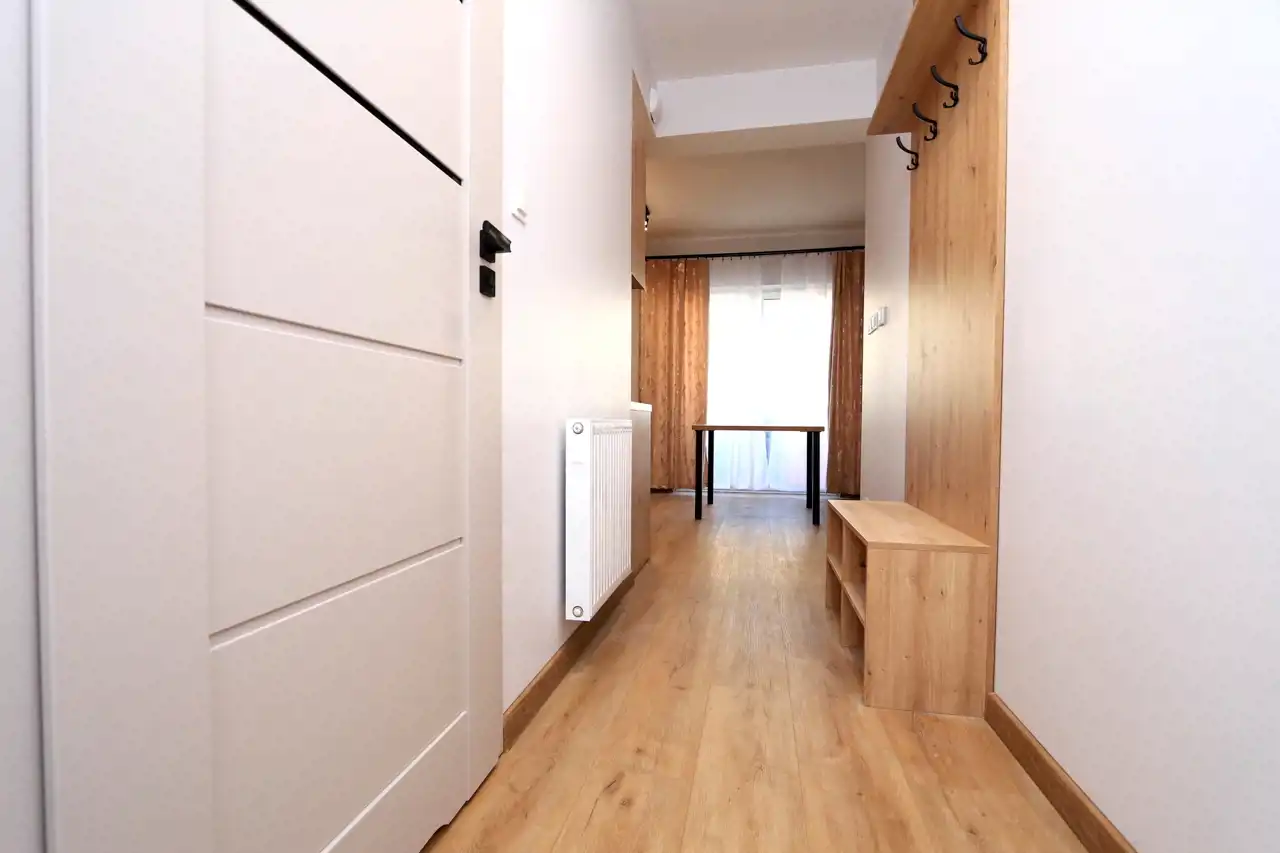 - Układ: Salon z aneksem kuchennym, sypialnia, łazienka, przedpokój