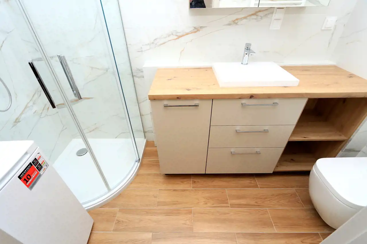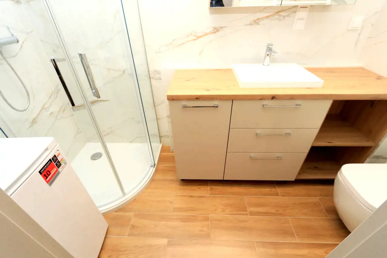 - Zabudowę kuchenną z nowoczesnym sprzętem AGD (zmywarka, lodówka, piekarnik, płyta indukcyjna)