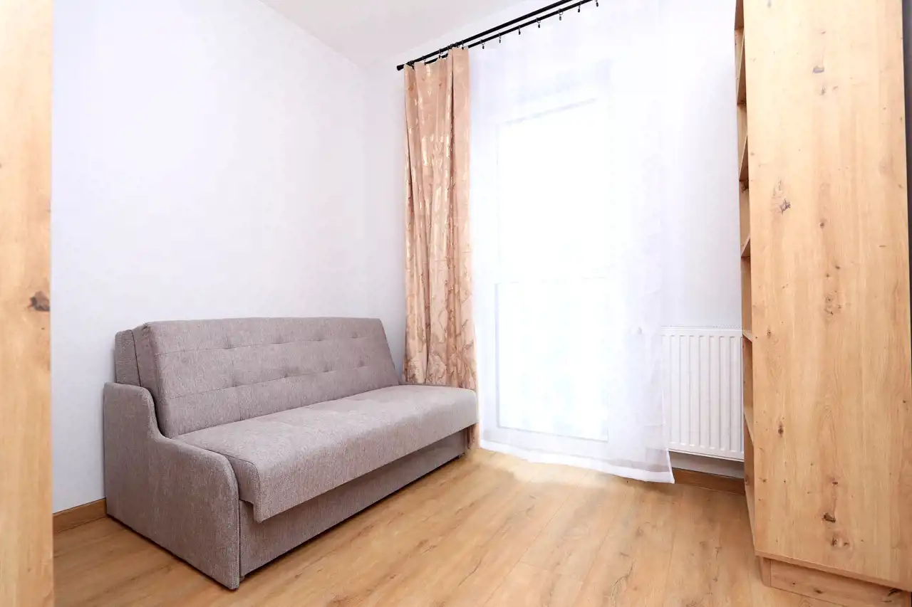 - Układ: Salon z aneksem kuchennym, sypialnia, łazienka, przedpokój