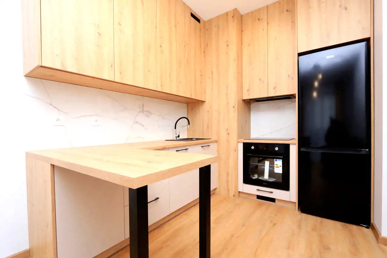 Mieszkanie zostało zrealizowane z dbałością o najwyższe standardy, przy użyciu materiałów wysokiej jakości, dzięki współpracy z renomowaną firmą wykończeniową i meblarską. W pełni wyposażona kuchnia obejmuje: