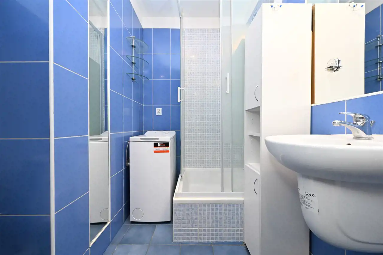 Mieszkanie umeblowane i wyposażone. Łazienka z umywalką, prysznicem, pralką.