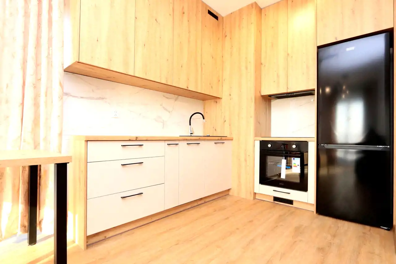Mieszkanie zostało zrealizowane z dbałością o najwyższe standardy, przy użyciu materiałów wysokiej jakości, dzięki współpracy z renomowaną firmą wykończeniową i meblarską. W pełni wyposażona kuchnia obejmuje: