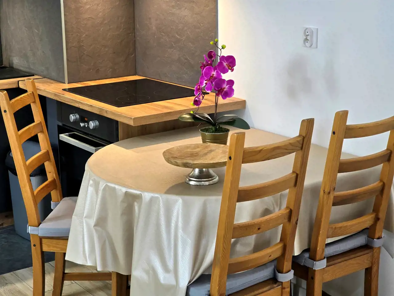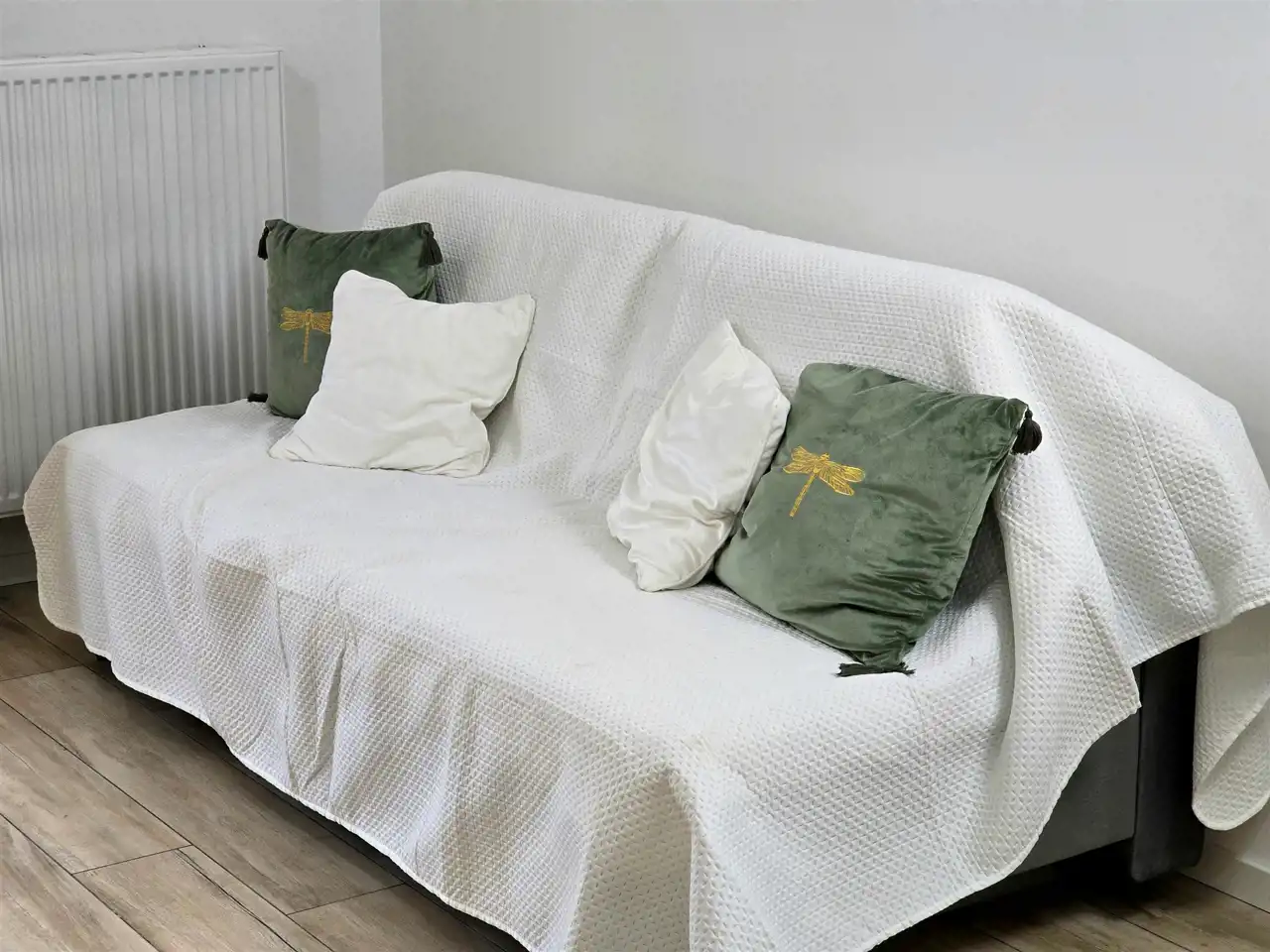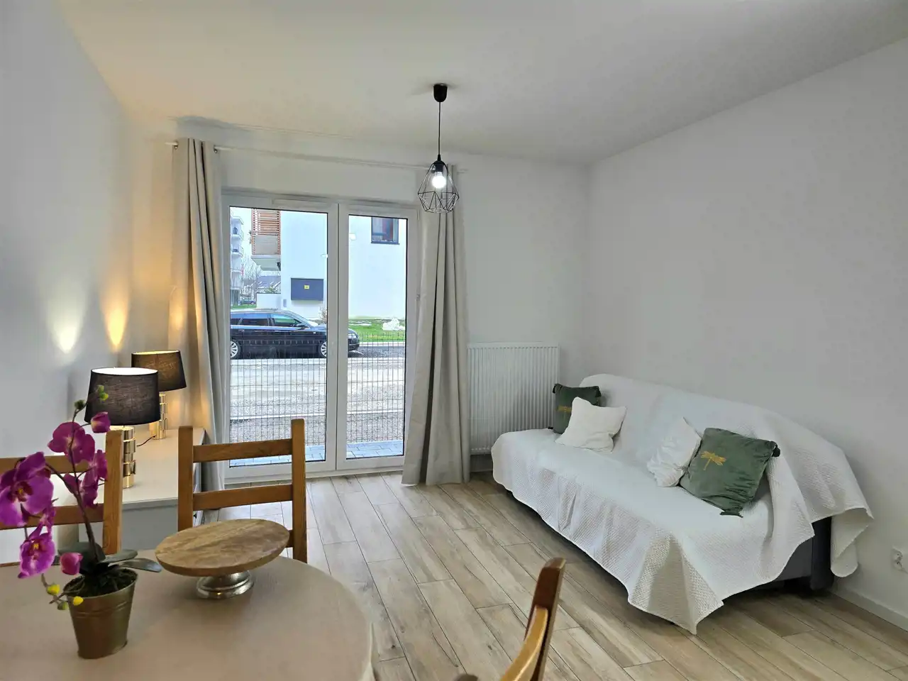 - jasny salon z rozkładaną kanapą, TV wraz nowoczesnym aneksem kuchennym wyposażonym w najpotrzebniejsze sprzęty AGD