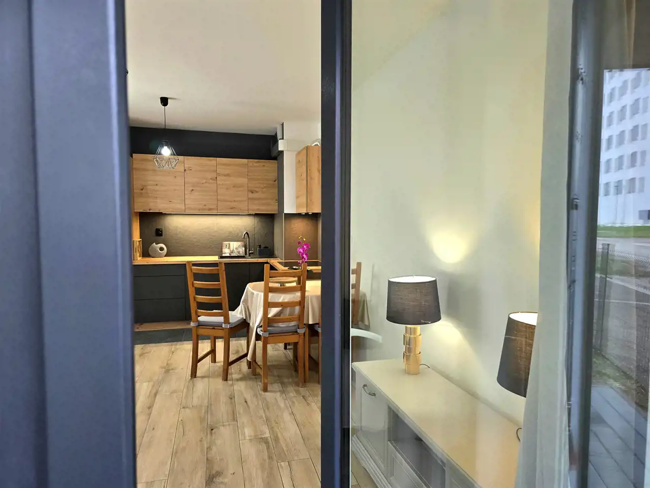 Mieszkanie jest jasne i nasłonecznione. Wykończone w najlepszej jakości panele lub płytki. Dla większego komfortu użytkowania w łazience jak i w części kuchennej znajduje się ogrzewanie podłogowe. Aneks kuchenny jest wyposażony w nowoczesne meble, wysokiej jakości lodówkę, indukcyjną płytę grzewczą oraz piekarnik.