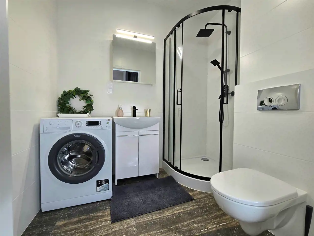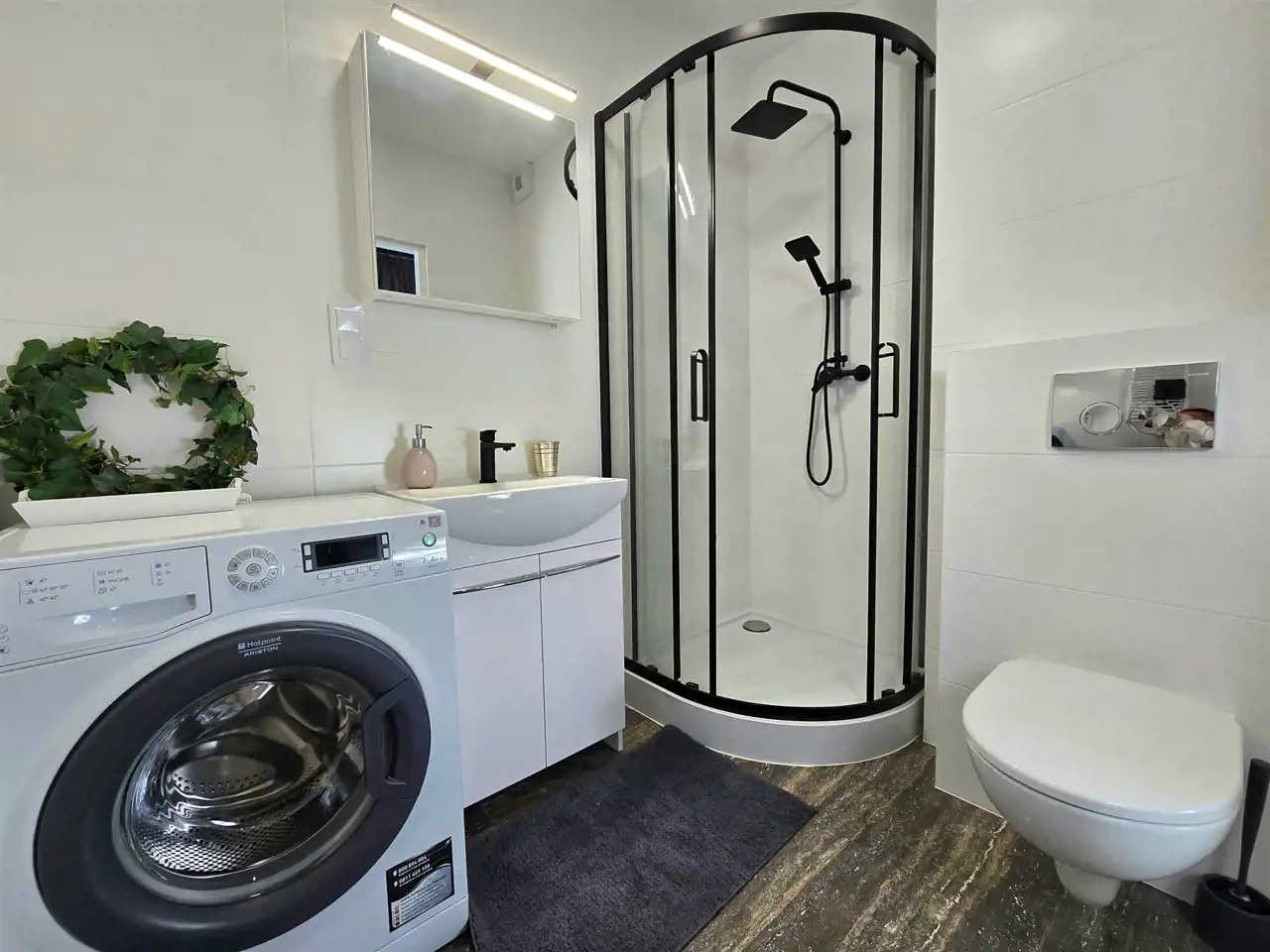 - nowocześnie zaaranżowana duża łazienka z prysznicem oraz z wc