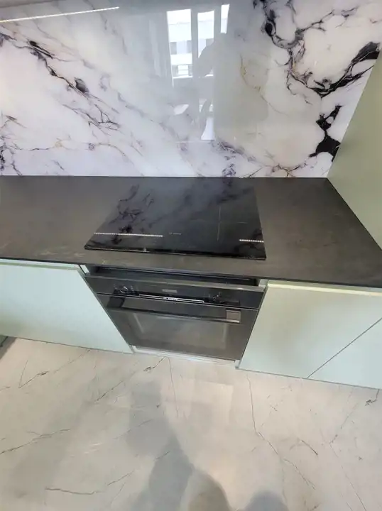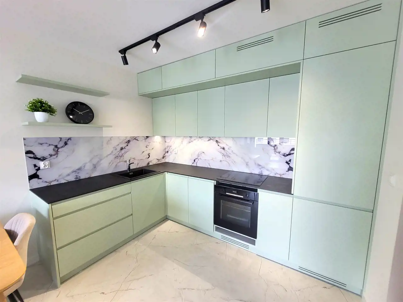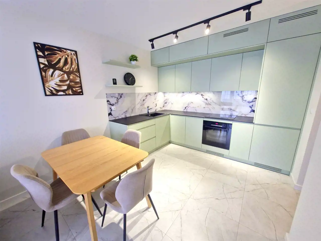 - kuchnia wyposażona w meble kuchenne w zabudowie wraz ze sprzętem AGD: indukcja, piekarnik, zmywarka, lodówka, stół z krzesłami