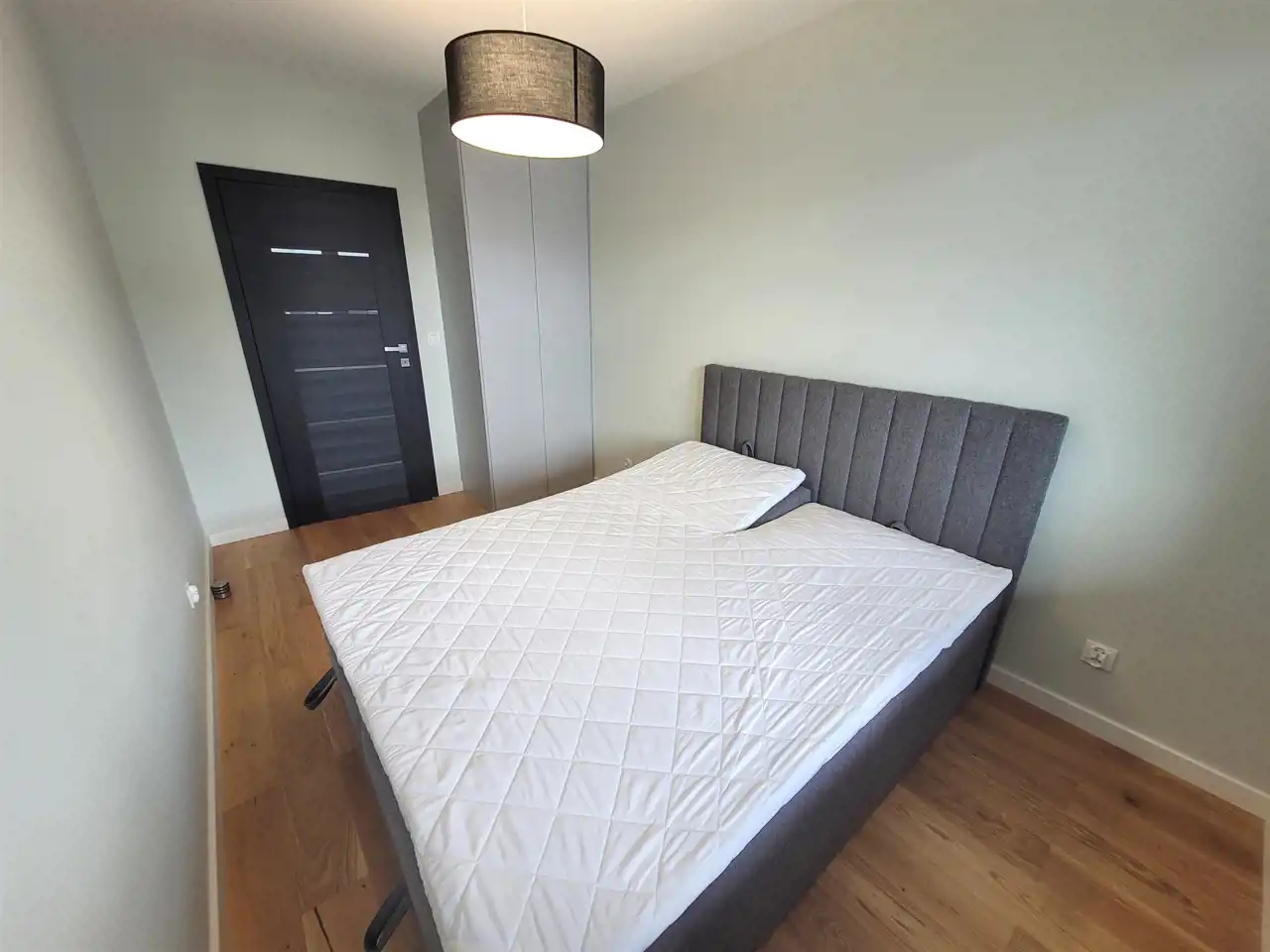 - w sypialni łóżko z materacem oraz szafa