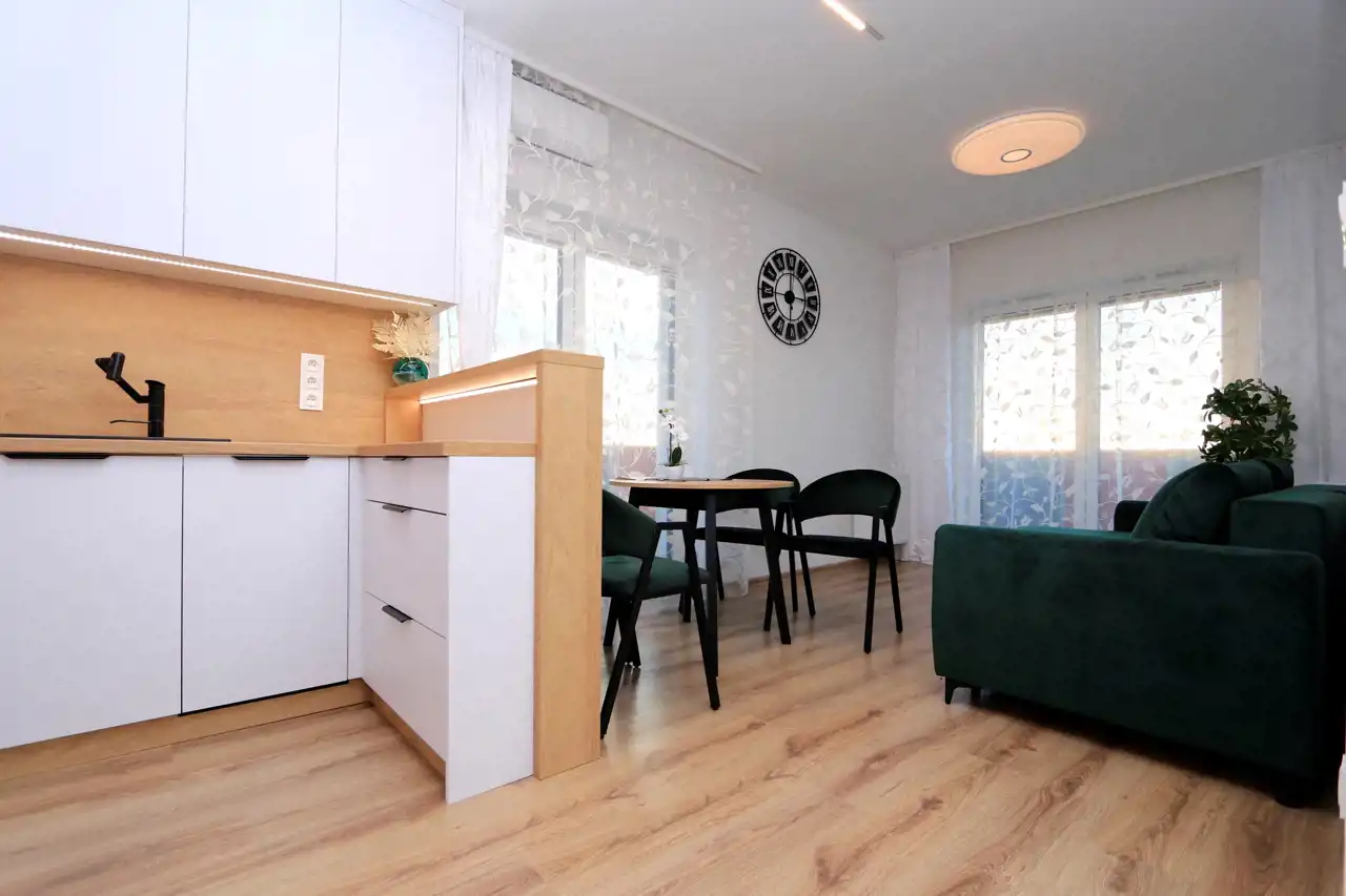 - Układ: Salon z aneksem kuchennym, sypialnia, łazienka, przedpokój