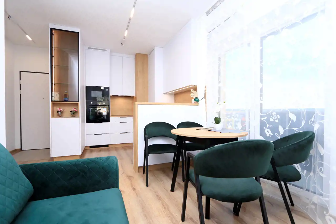 Mieszkanie zostało zrealizowane z dbałością o najwyższe standardy, przy użyciu materiałów wysokiej jakości, dzięki współpracy z renomowaną firmą wykończeniową i meblarską. W pełni wyposażona kuchnia obejmuje: