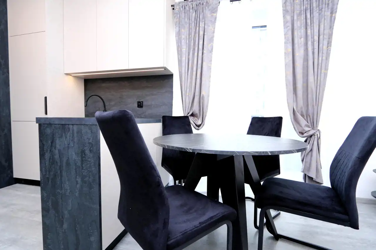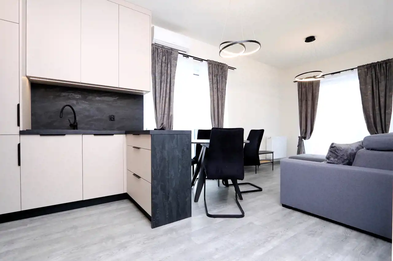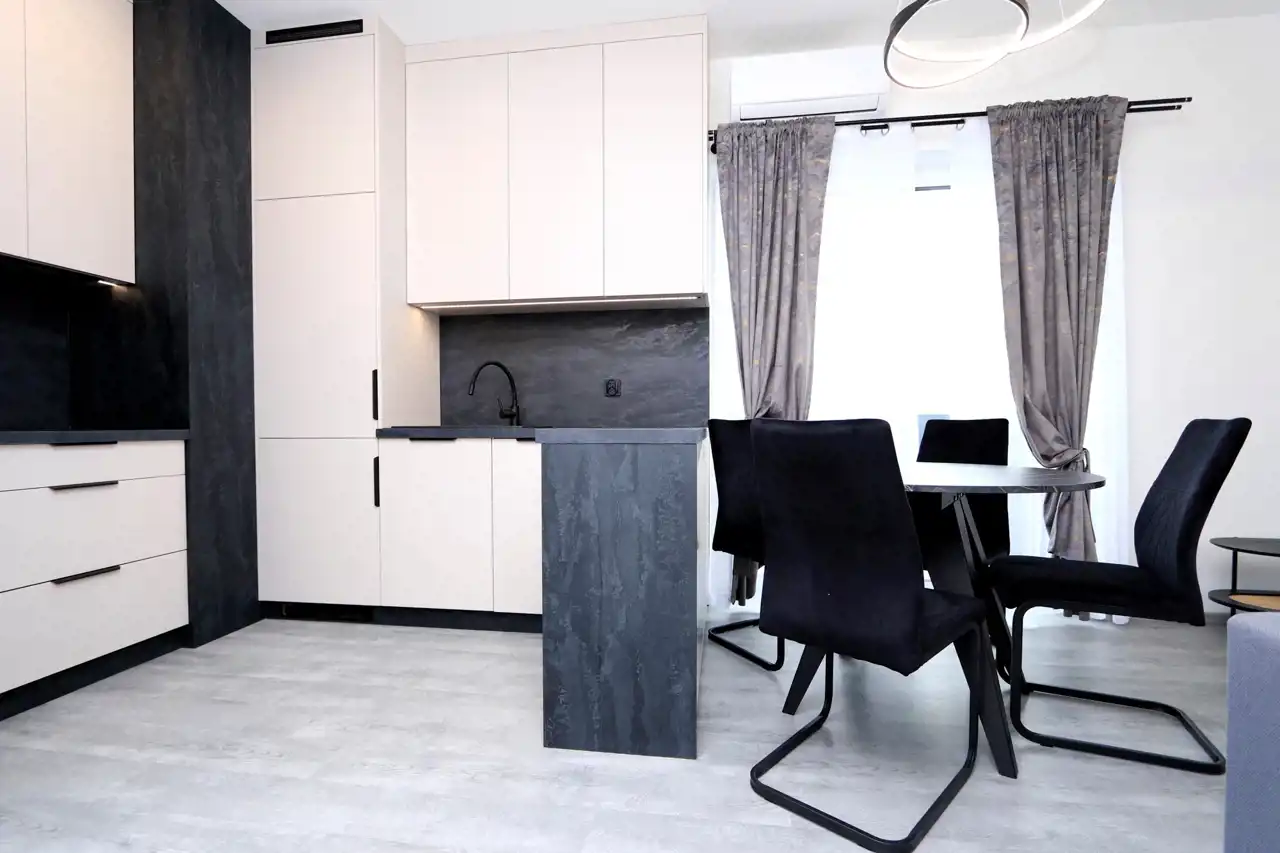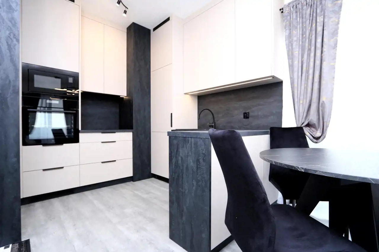 Mieszkanie zostało zrealizowane z dbałością o najwyższe standardy, przy użyciu materiałów wysokiej jakości, dzięki współpracy z renomowaną firmą wykończeniową i meblarską. W pełni wyposażona kuchnia obejmuje: