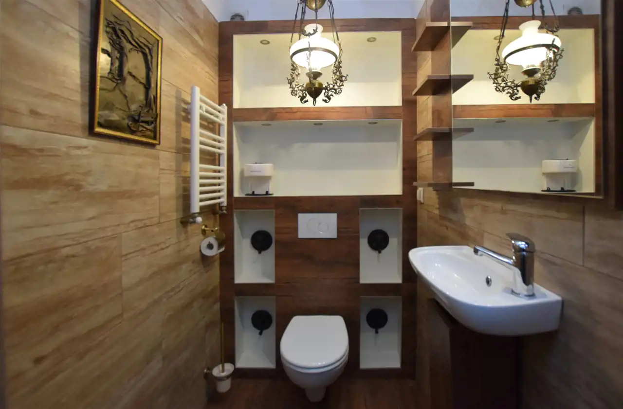 - sprzęt AGD: lodówka, zmywarka (nowa), mikrofalówka, indukcyjna płyta grzewcza (nowa), piekarnik elektryczny, ekspres do kawy przelewowy, pralka 8 kg, żelazko