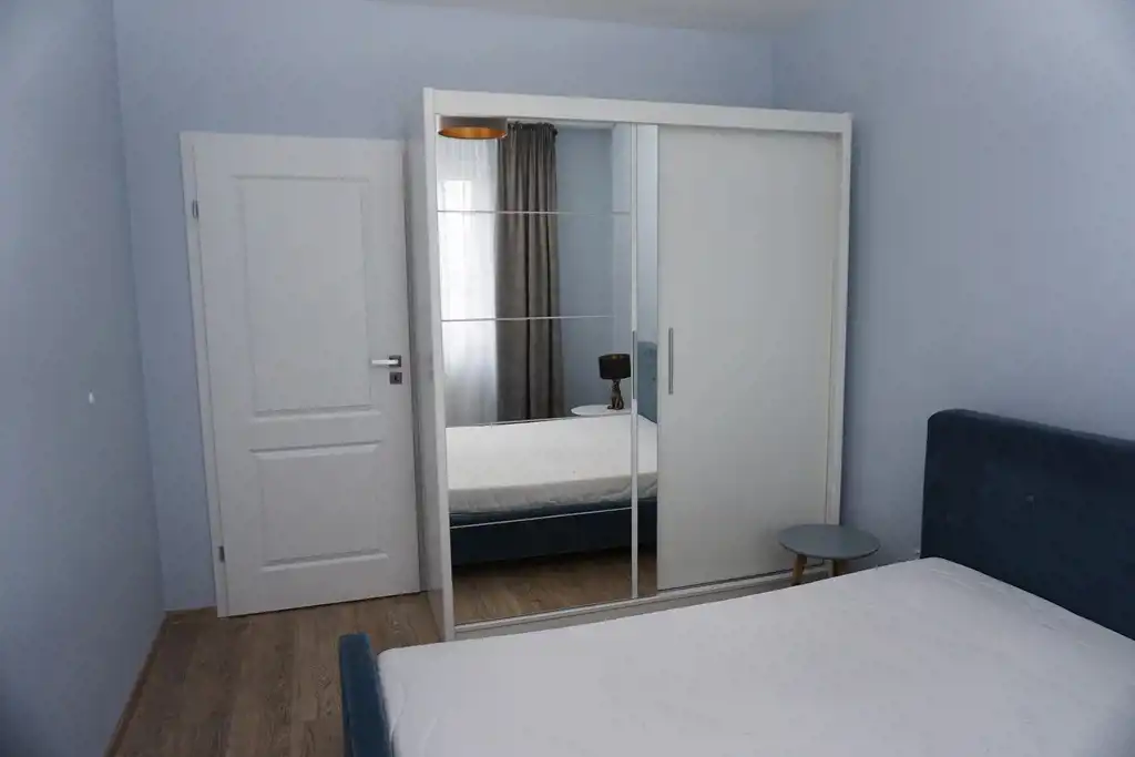 - w sypialni: podwójne łóżko, szafa, stoliki nocne, komoda