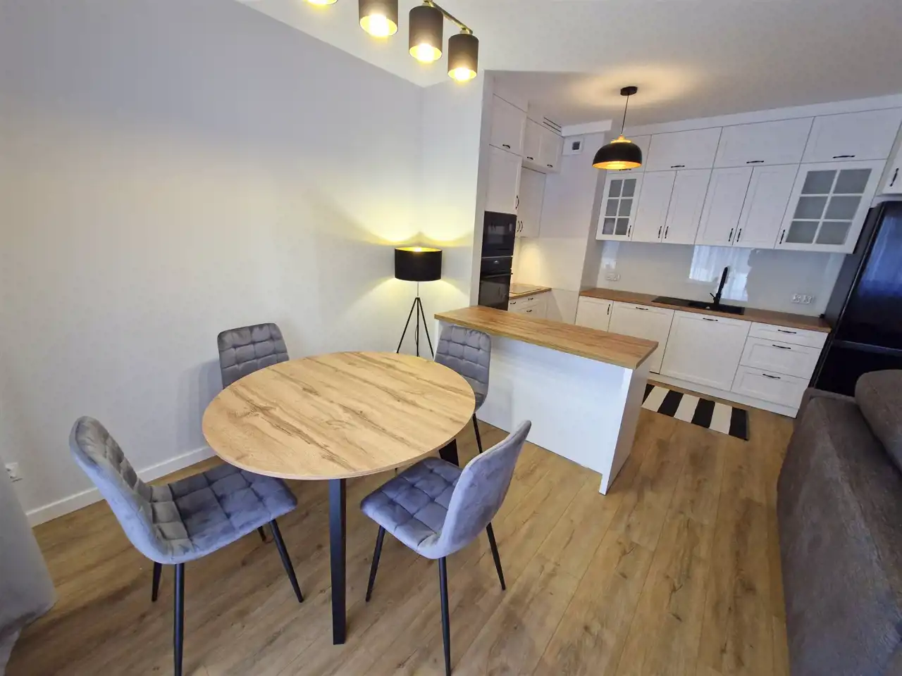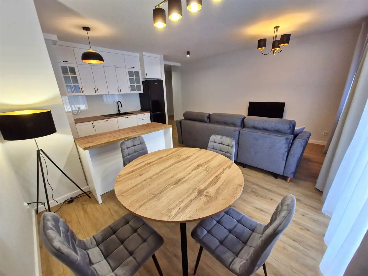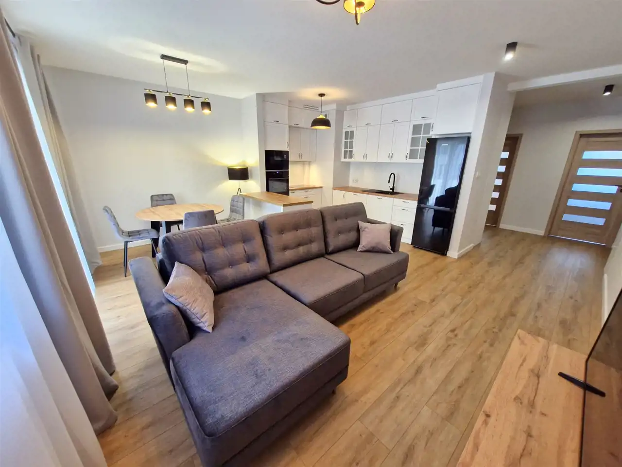 - salon z aneksem kuchennym w zabudowie wraz ze sprzętem AGD (zmywarka, lodówka, piekarnik, płyta indukcyjna)