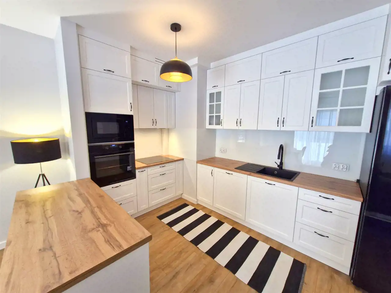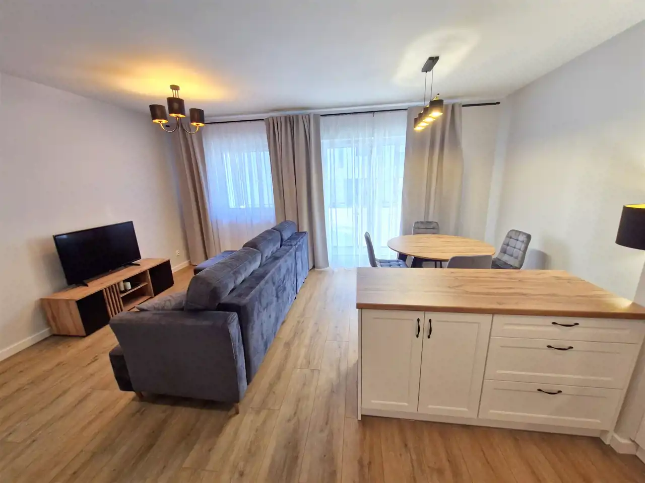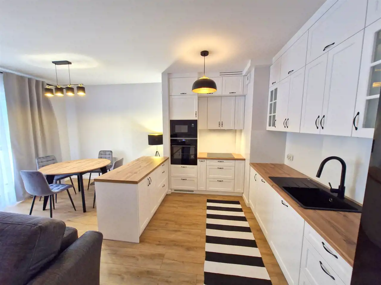 - salon z aneksem kuchennym w zabudowie wraz ze sprzętem AGD (zmywarka, lodówka, piekarnik, płyta indukcyjna)
