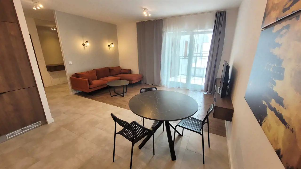 - salon wyposażony w stół z krzesłami, sofę, ławę, szafkę RTV oraz telewizor
