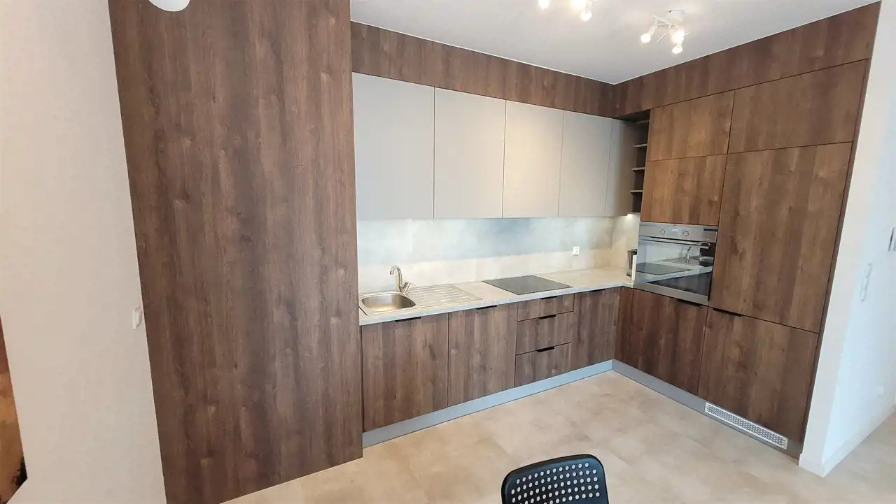 - kuchnia w zabudowie wraz ze sprzętem AGD: lodówka, płyta indukcyjna, piekarnik, zmywarka, mikrofala