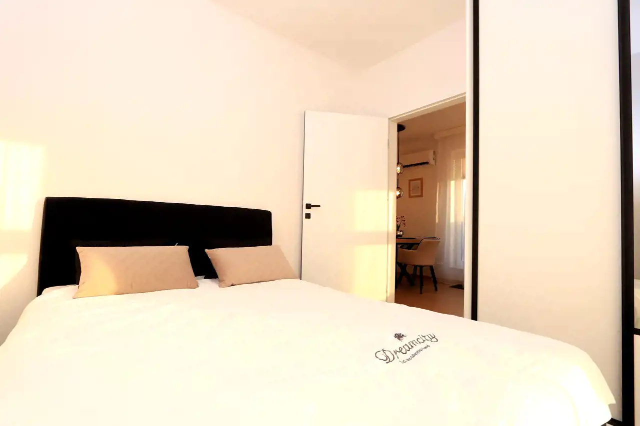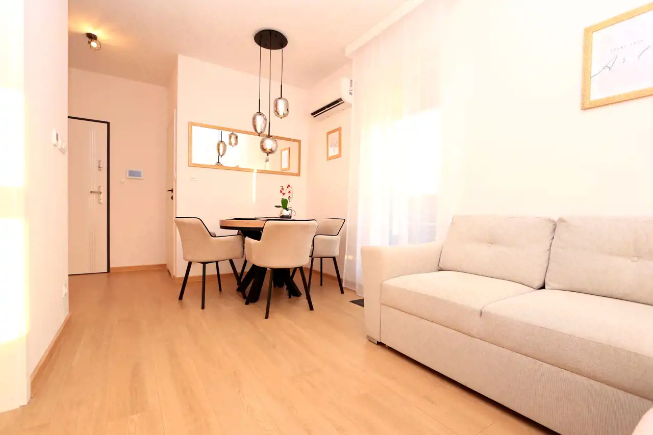 - Układ: Salon z aneksem kuchennym, sypialnia, łazienka, przedpokój