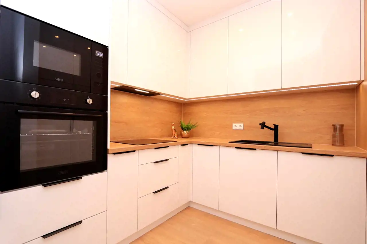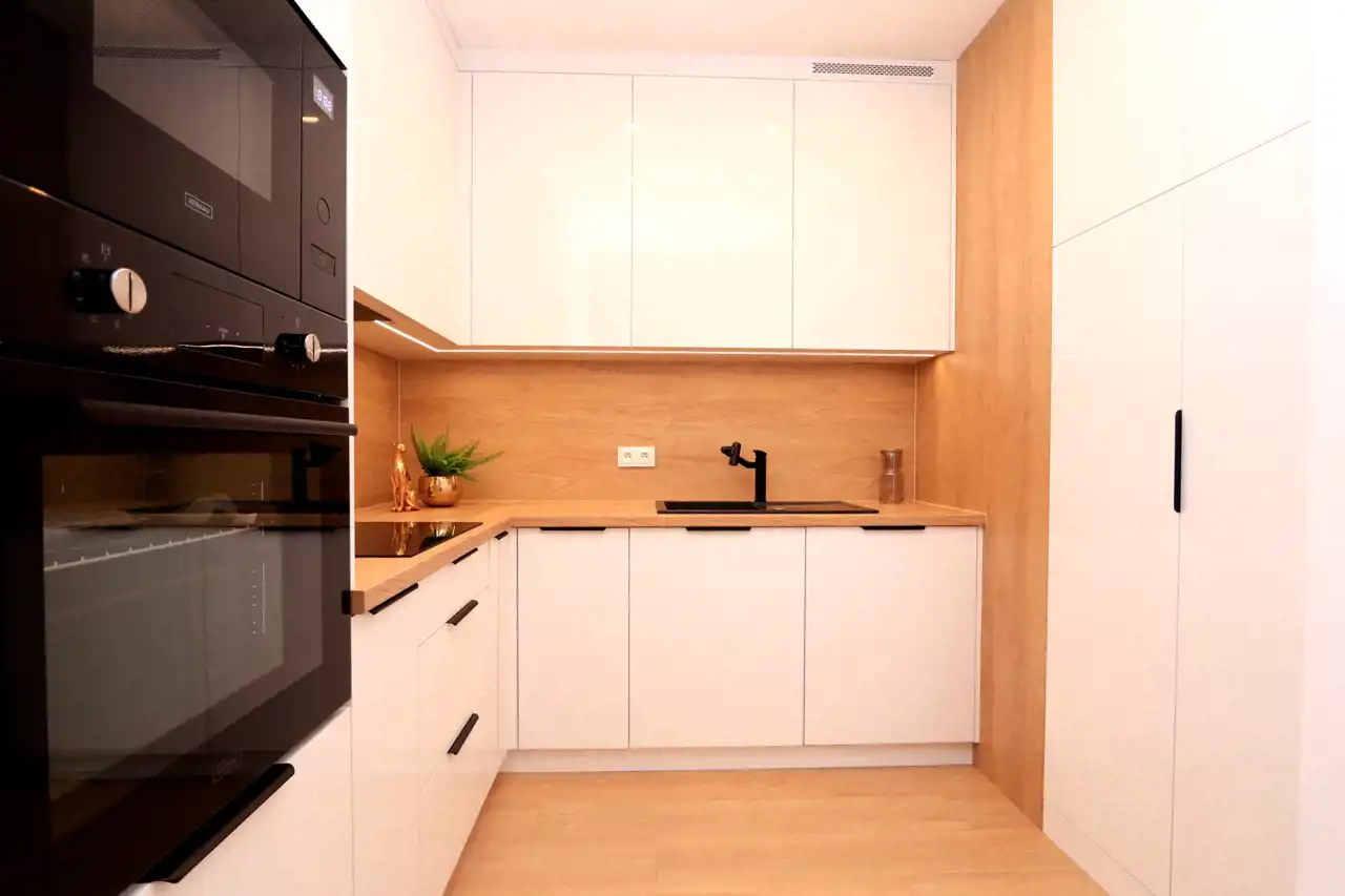 Mieszkanie zostało zrealizowane z dbałością o najwyższe standardy, przy użyciu materiałów wysokiej jakości, dzięki współpracy z renomowaną firmą wykończeniową i meblarską. W pełni wyposażona kuchnia obejmuje: