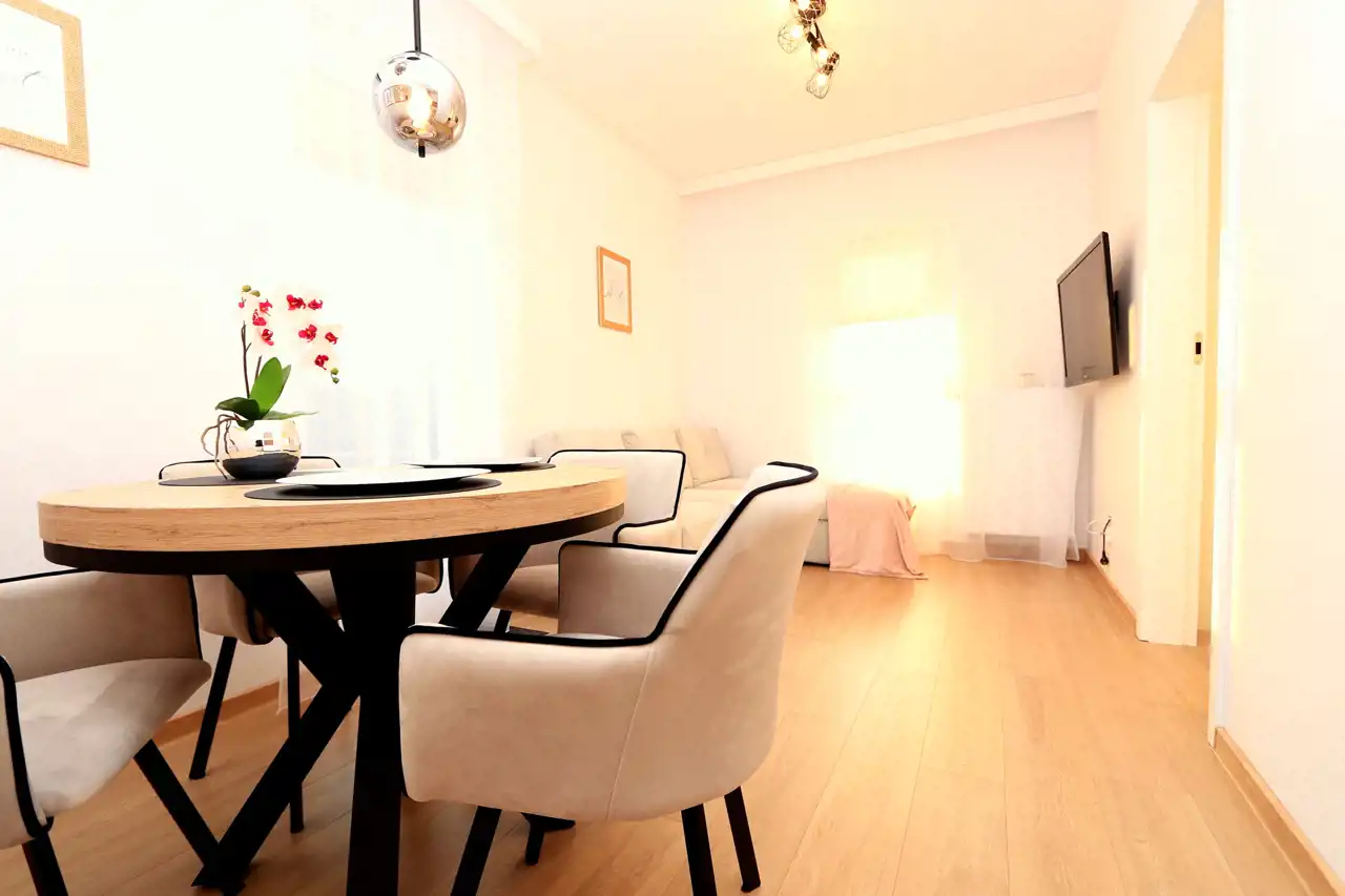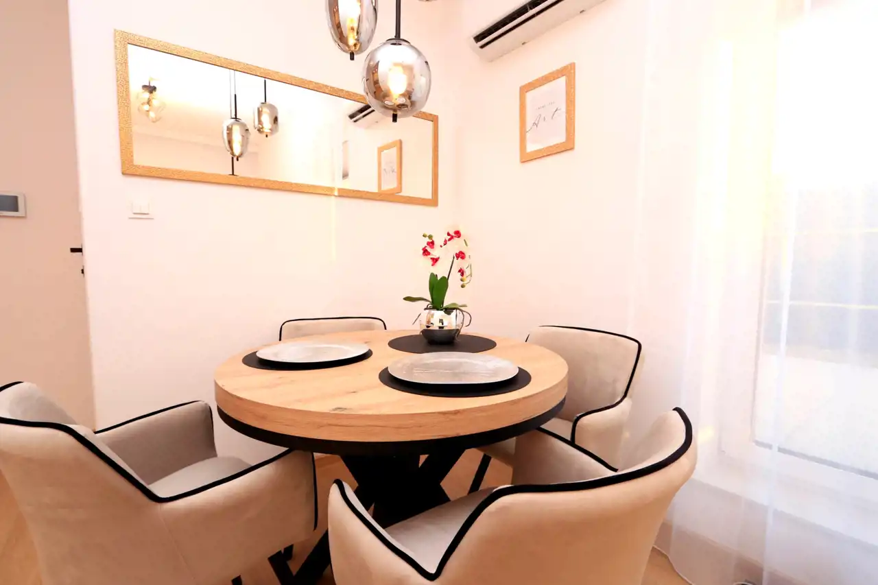 - Zabudowę kuchenną z nowoczesnym sprzętem AGD (zmywarka, lodówka, piekarnik, płyta indukcyjna)