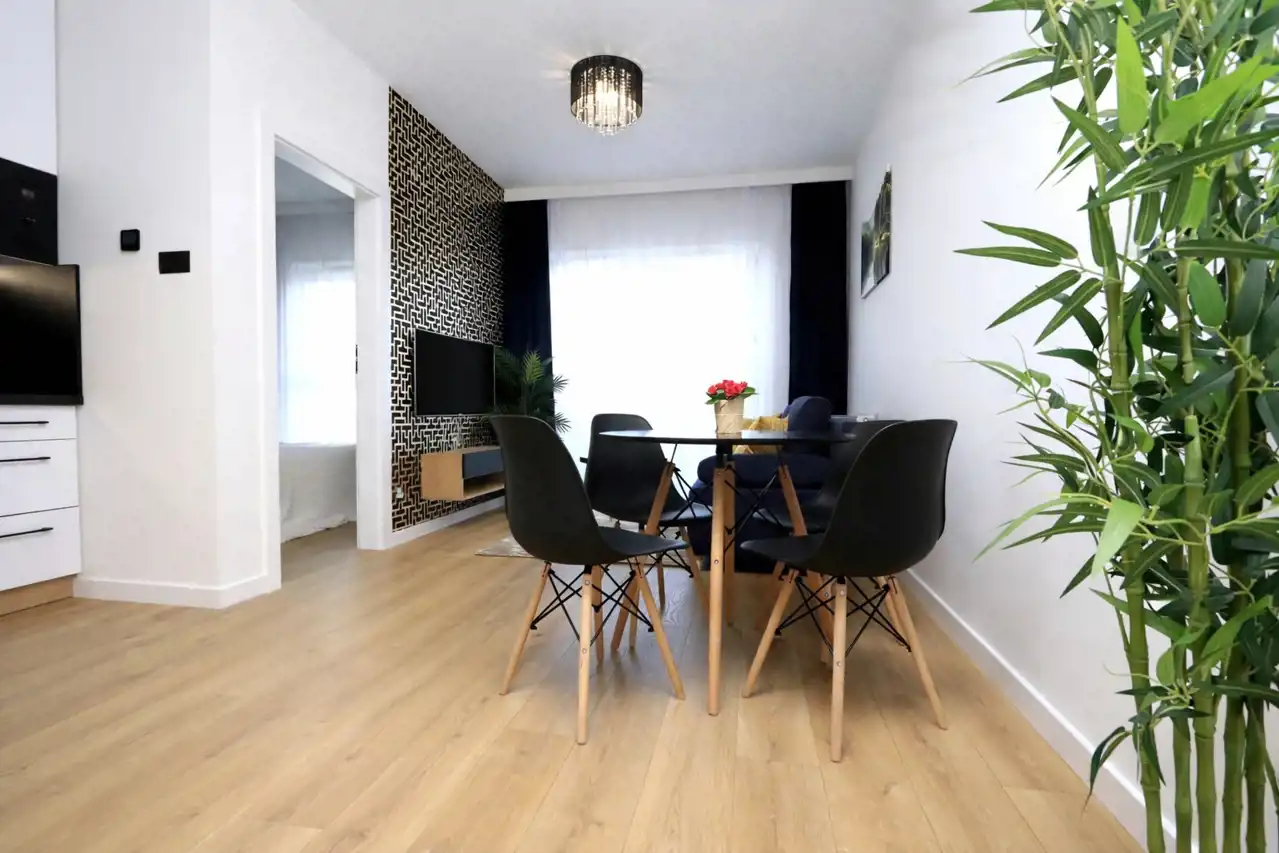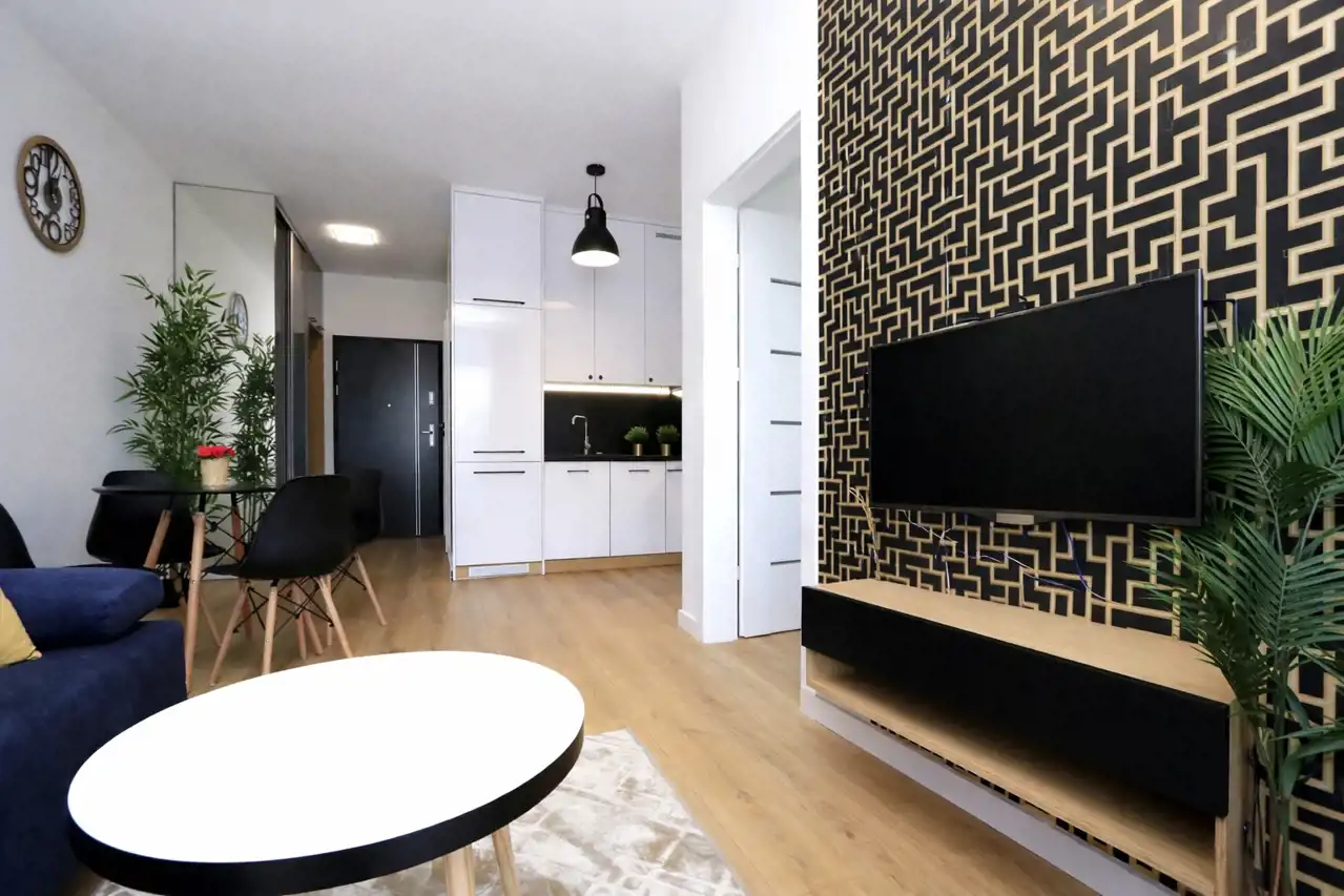 Mieszkanie jest nowocześnie umeblowane i wyposażone w niezbędne sprzęty. Salon z kuchnią są przestrzenne. W przedpokoju znajduje się duża szafa.