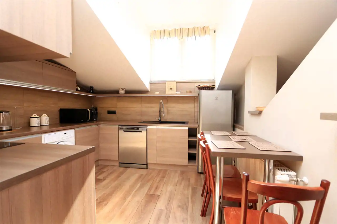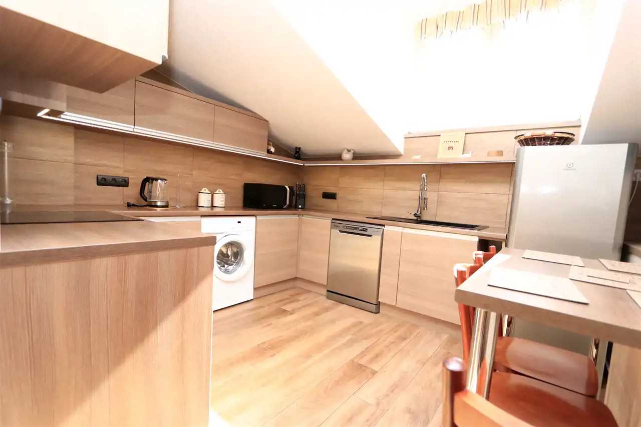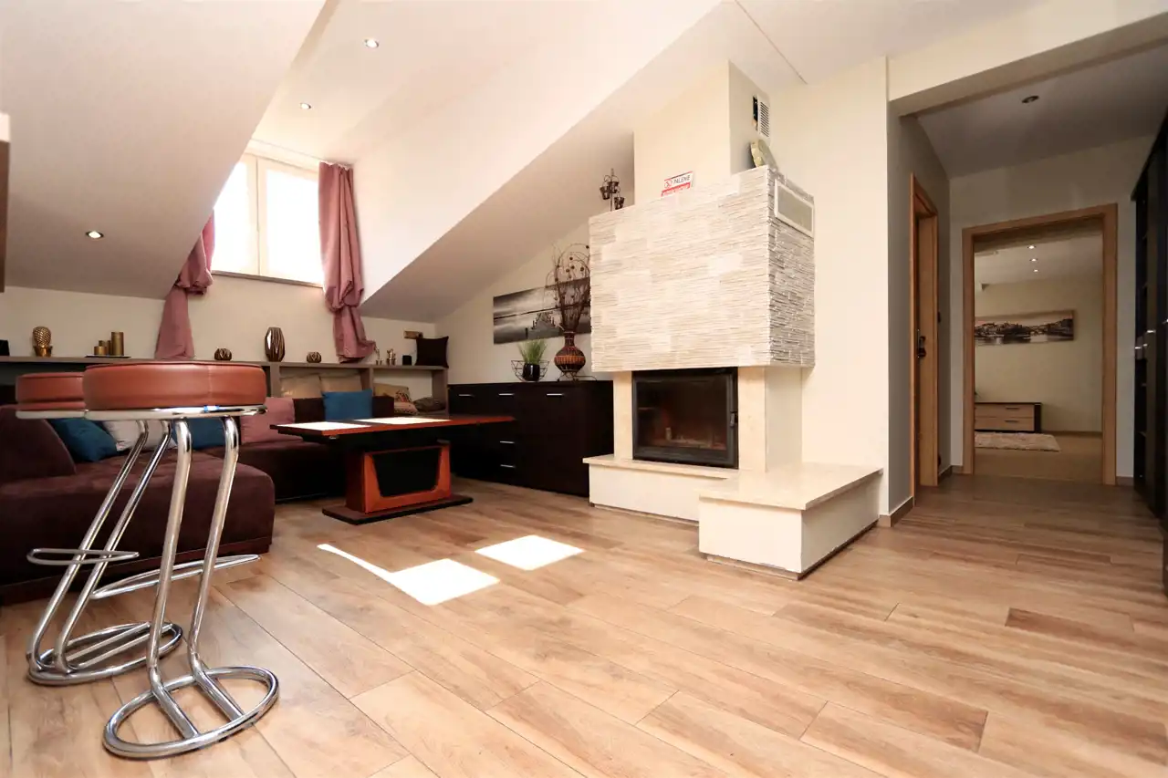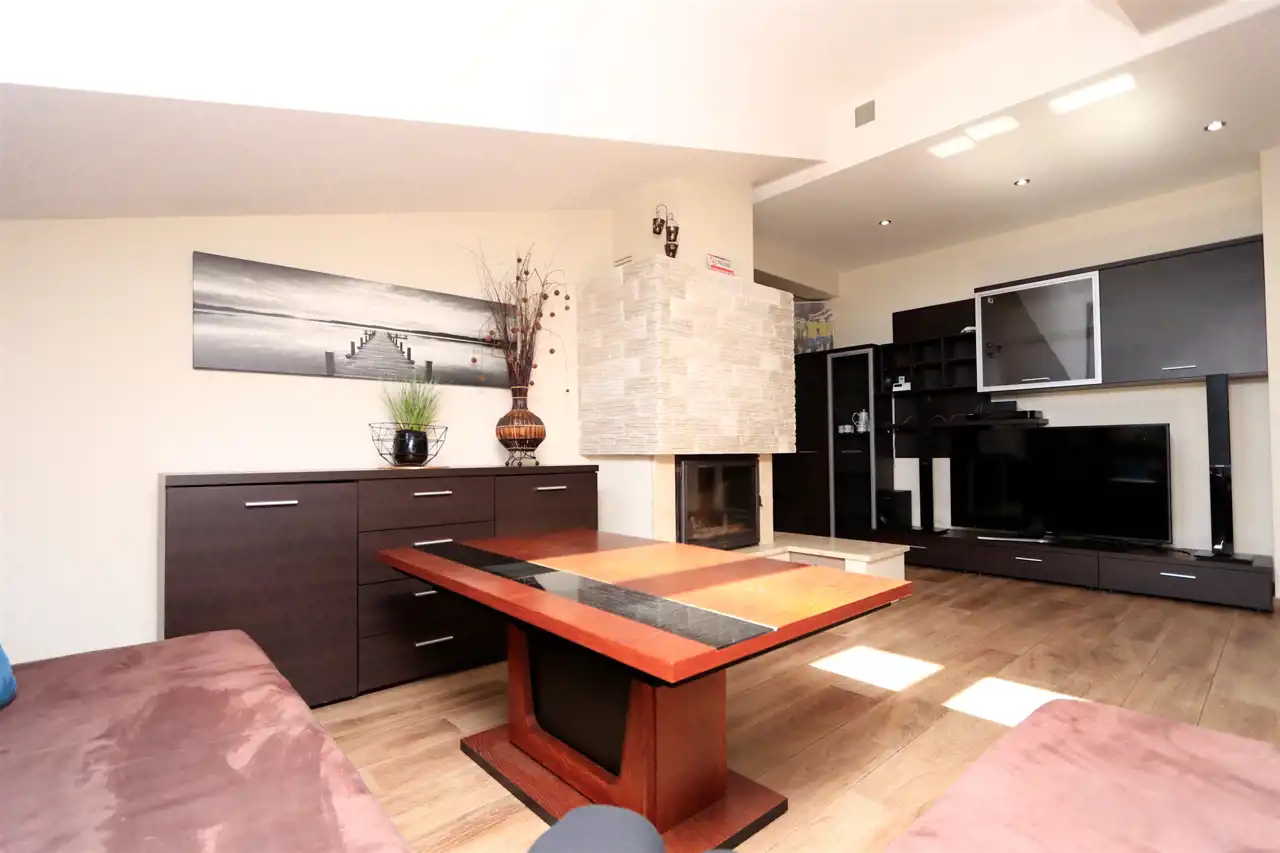 W salonie znajduje się funkcjonalna strefa wypoczynkowa oraz kominek. Aneks kuchenny wyposażony jest w niezbędny sprzęt AGD oraz przestrzeń jadalnianą.