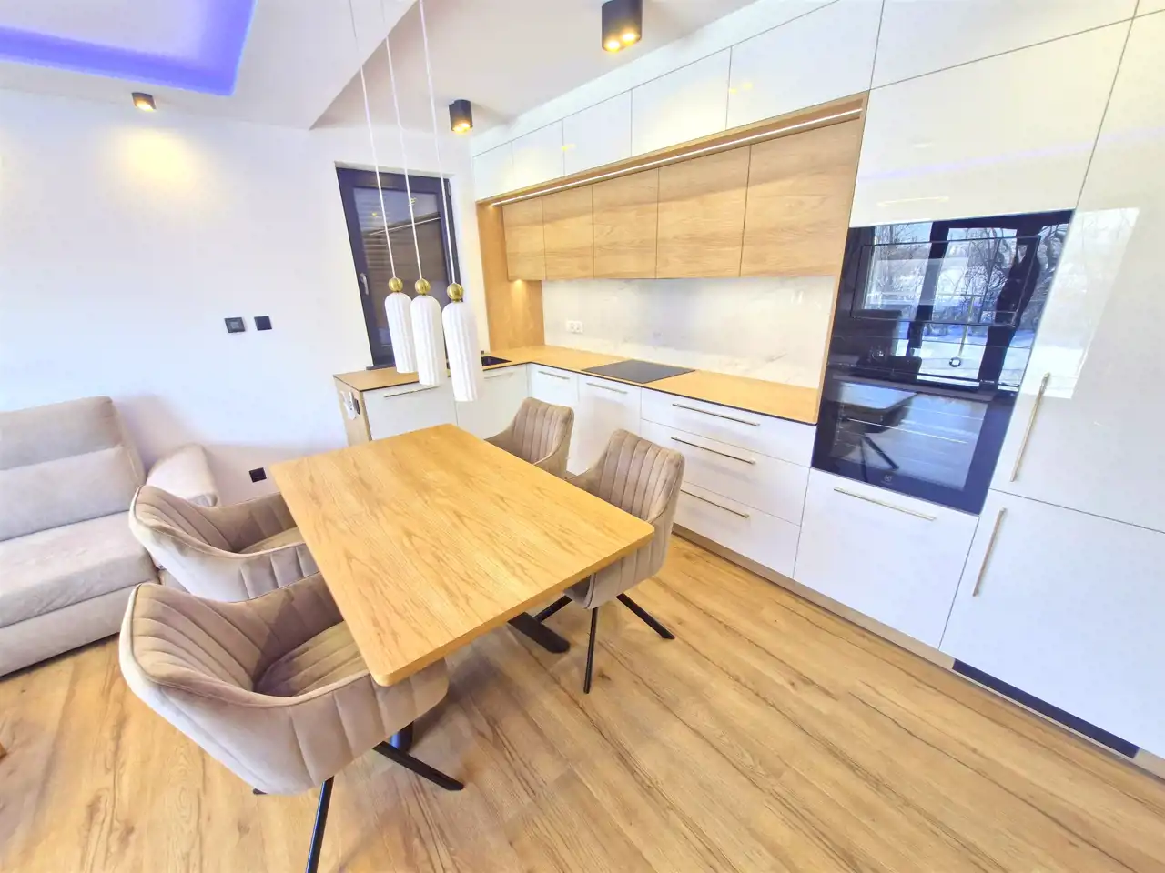 - wysokiej jakości kuchnia w zabudowie wraz ze sprzętem AGD : płyta indukcyjna, piekarnik, lodówka, okap, zmywarka, mikrofala