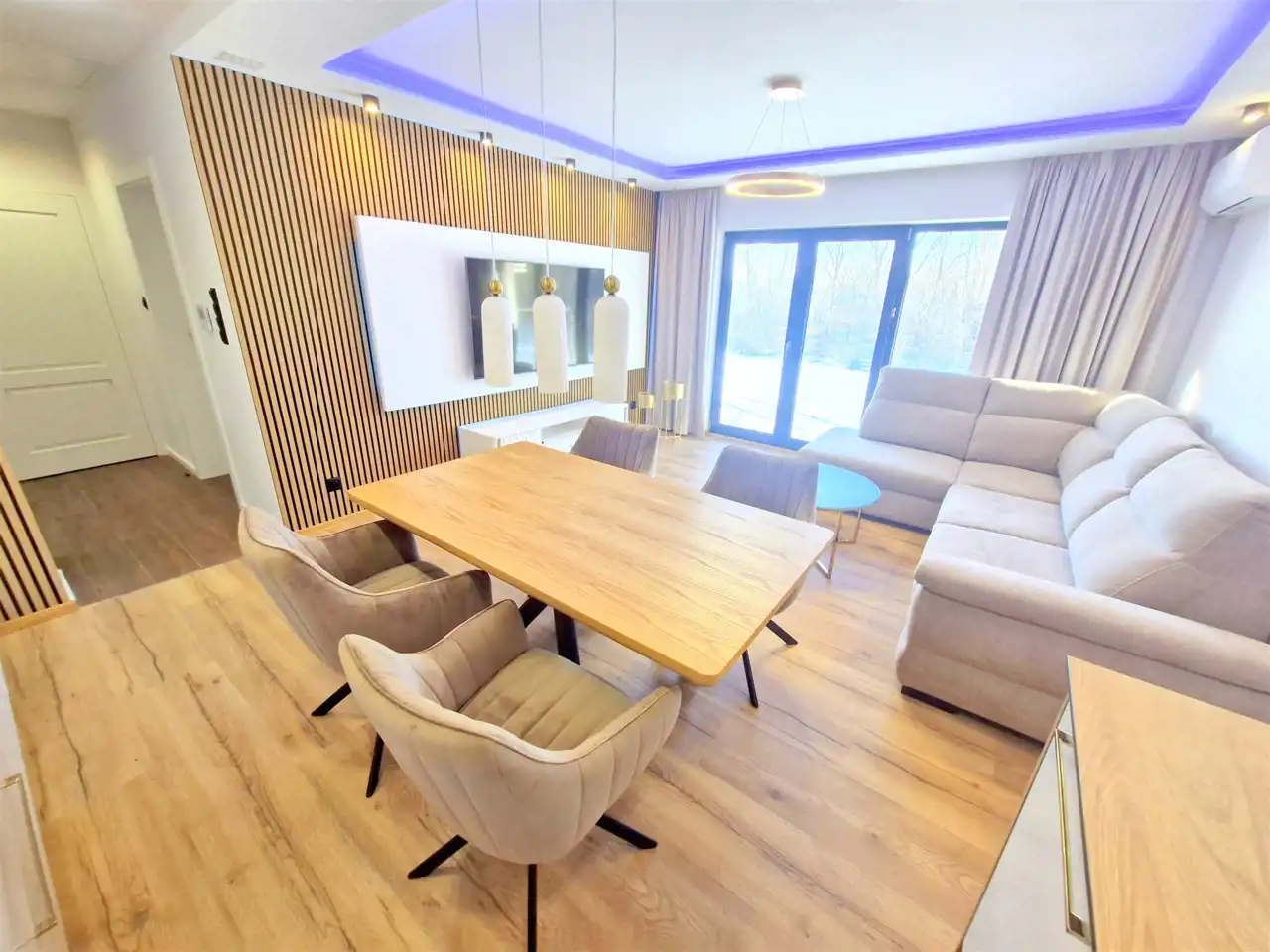 - salon wyposażony w wygodny narożnik , stolik, szafkę RTV + telewizor oraz stół z krzesłami