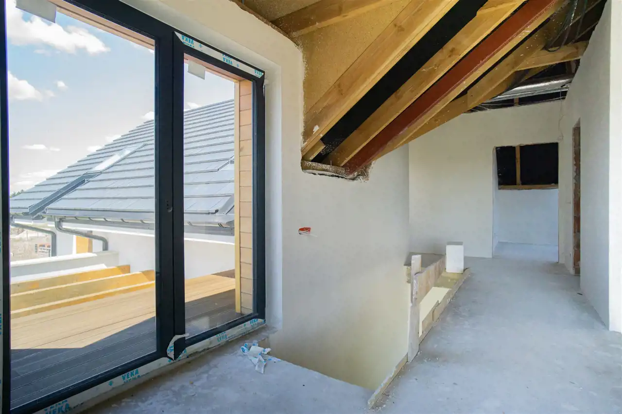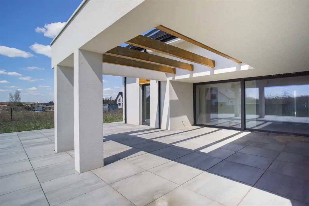 - w sercu domu łączącym salon z jadalnią z jego pozostałą częścią znajduje się szerokie na 5 metrów przesuwne oknoprowadzące na prawie 80 m2 taras