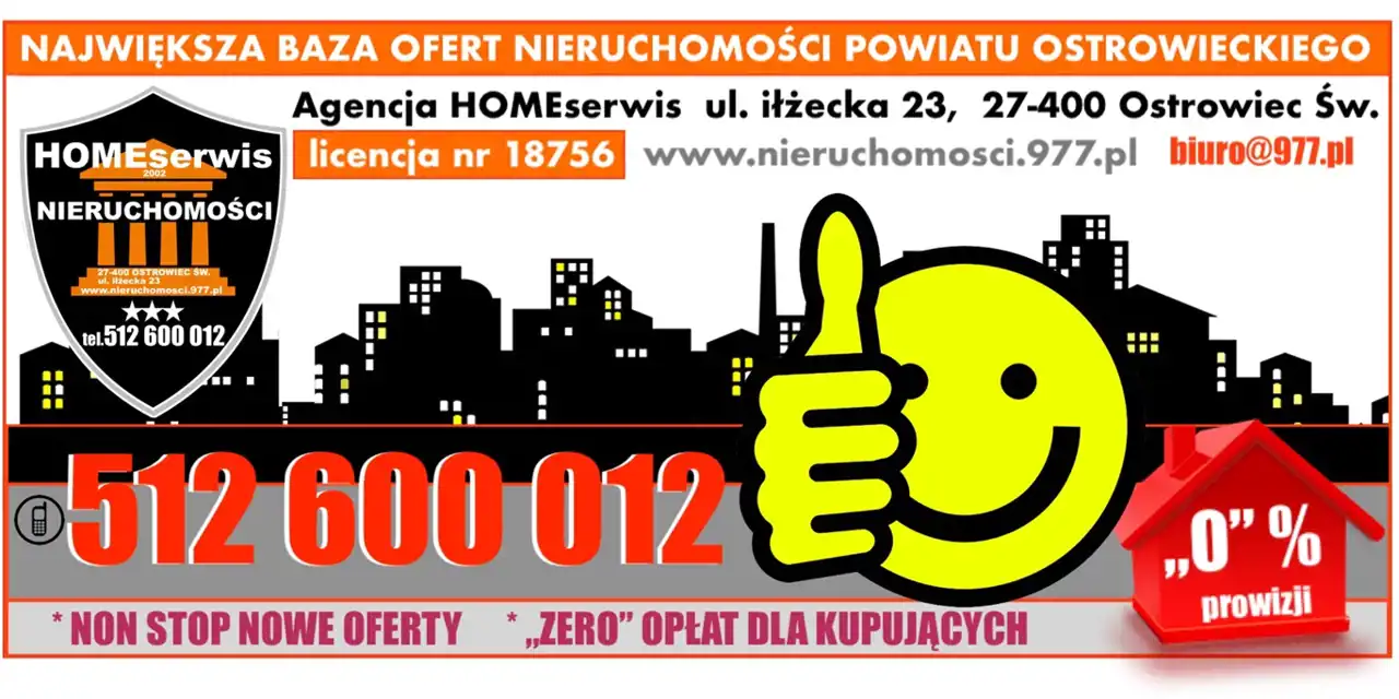 Serdecznie zapraszamy PAŃSTWA do współpracy. Nasze atuty to prawdziwa licencja pośrednika nieruchomości z zezwoleniem ministerstwa nr 18756 (licencja do wglądu w naszym biurze), wykształcenie na kierunku: Obrót, Wycena i Zarządzanie Nieruchomościami, wieloletnie doświadczenie i wiedza związana z rynkiem nieruchomości w woj. świętokrzyskim oraz całej Polsce, praca na podstawie Karty Praw Klienta. Zaufało nam tysiące klientów oraz deweloperzy nowych mieszkań oraz domów. U nas każdy klient może negocjować PROWIZJĘ OD 1 do 1,5%. Nie pobieramy ŻADNEJ PROWIZJI od poszukujących i kupujących, zatem WIELU KLIENTÓW CZUJE SIĘ BEZPIECZNIE. Bezpłatnie przyjmujemy także zlecenia poszukiwania domów, mieszkań, lokali i budynków bez pobierania jakichkolwiek opłat. U nas liczy się EFEKT bez ukrytych dodatkowych kosztów. PROSZĘ NAS ODWIEDZIĆ i sprawdzić naszą ofertę na www.nieruchomosci.977.pl