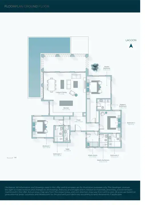 Dom o powierzchni 181 m2 , posadowiony na działce o powierzchni 789m2 z prywatnym basenem . Wnętrze domu to przestronny salon z aneksem kuchennym i wyjście na taras oraz prywatny ogród z dostępem do laguny i trzy sypialnie , każda z łazienką oraz hol.