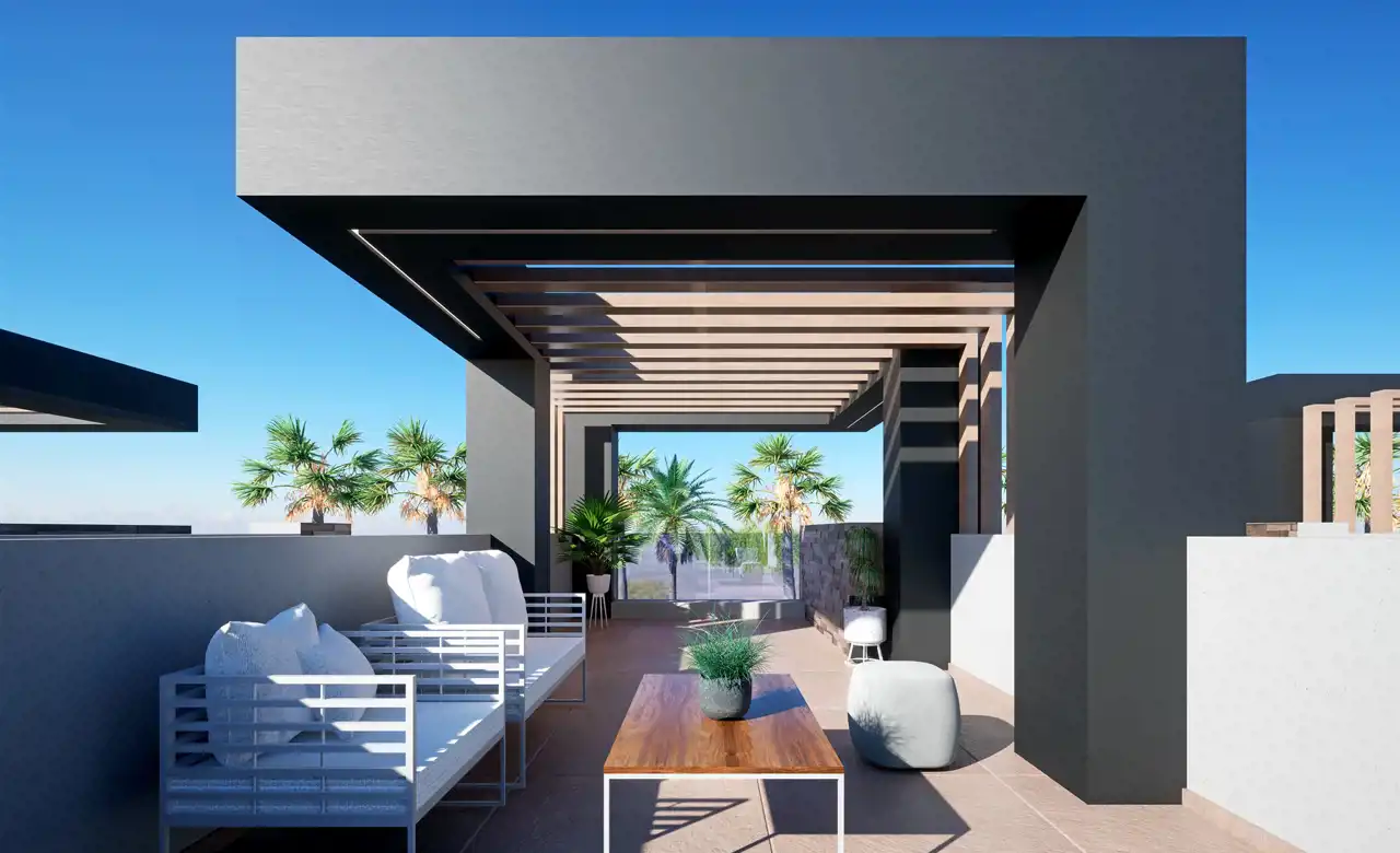 Domy zajmują jeden poziom plus taras-solarium na dachu z pergolą.