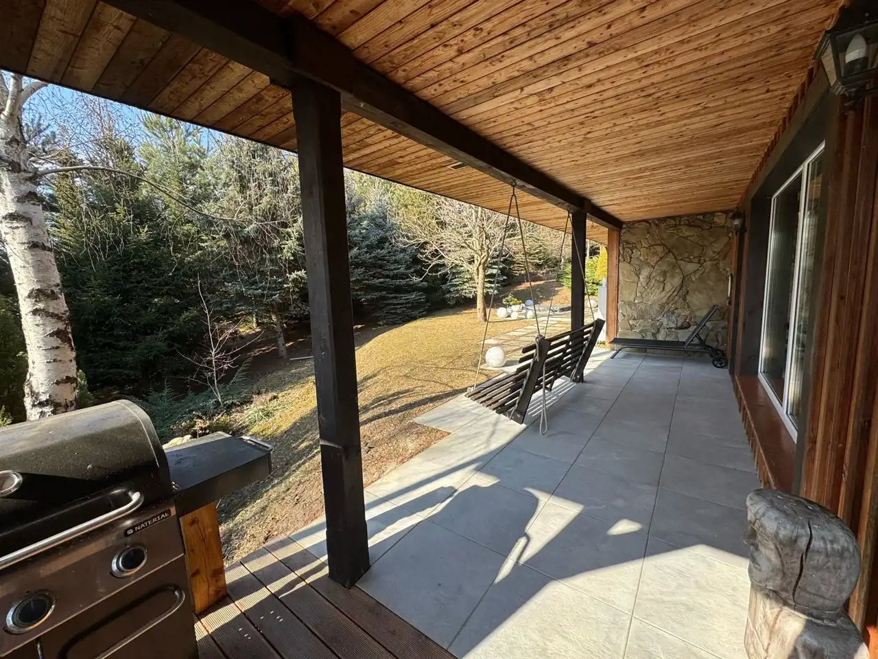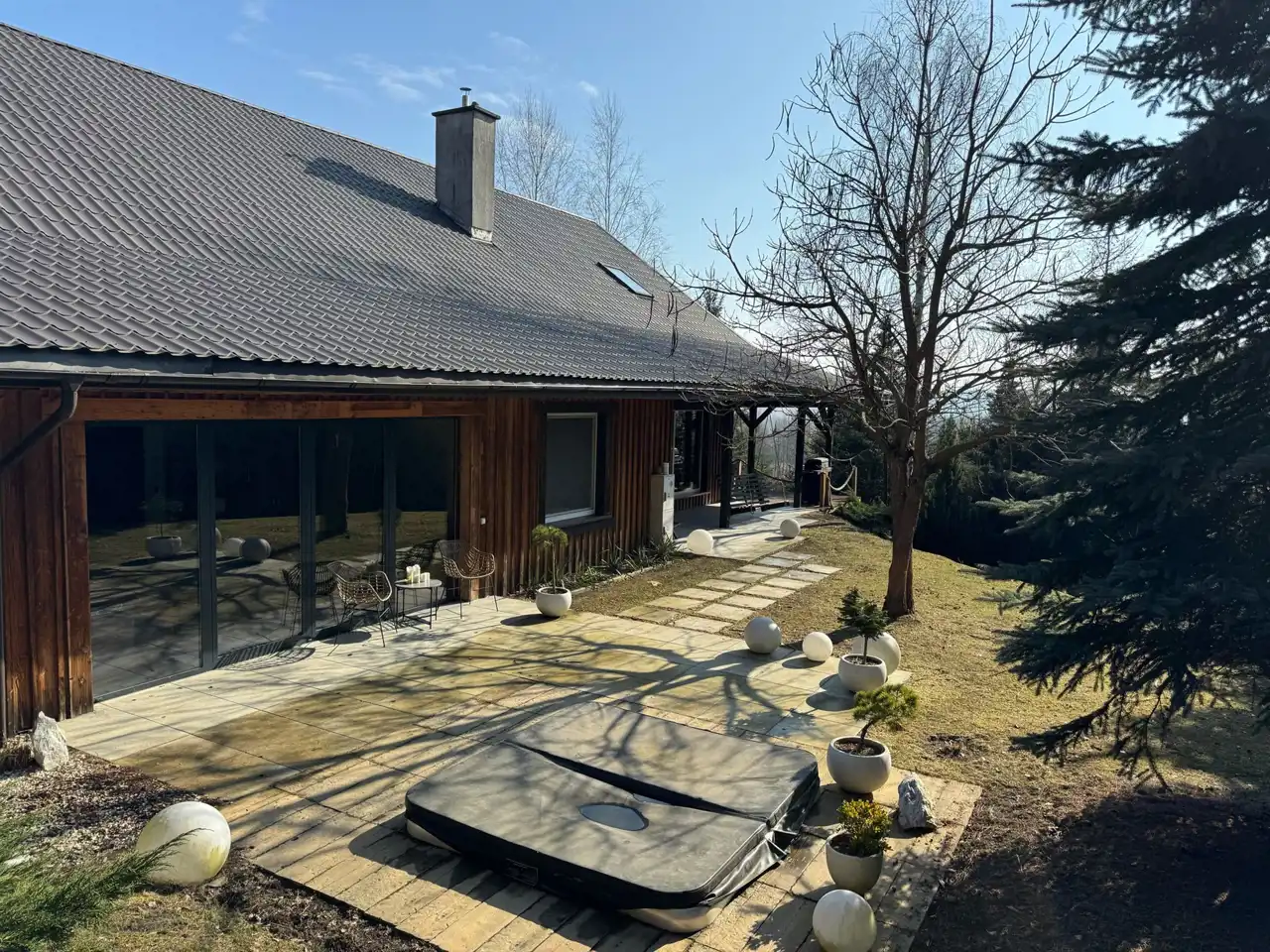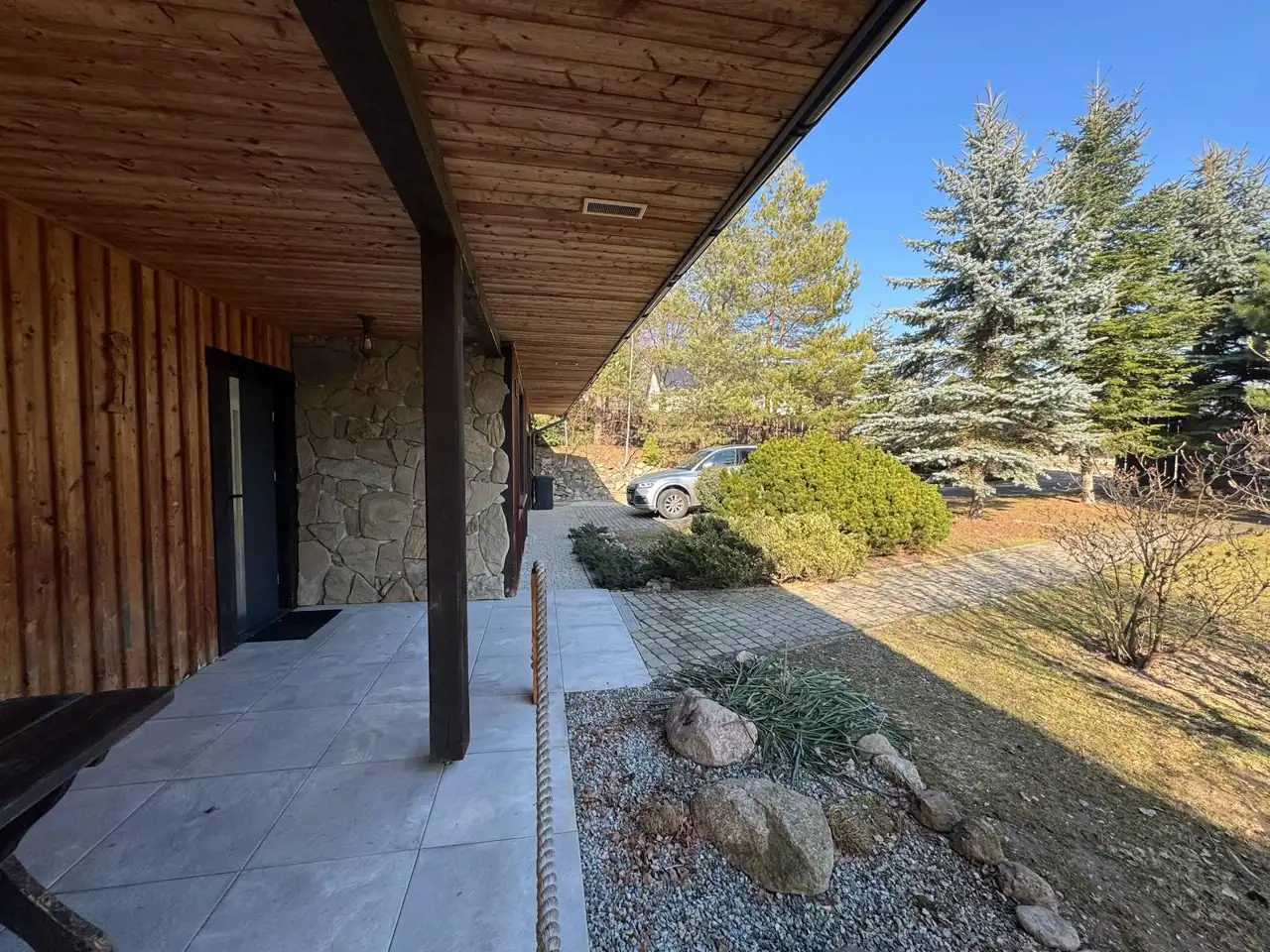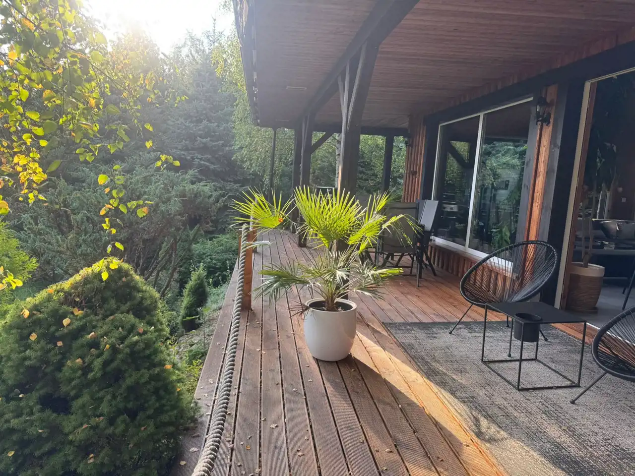 Piękne obszerne tarasy zadaszone, jadalnia na zewnątrz, sauna w części mieszkalnej, jacuzzi wkomponowane w taras zewnętrzny, a do tego olbrzymia część ogrodu pokryta starymi drzewami iglastymi.