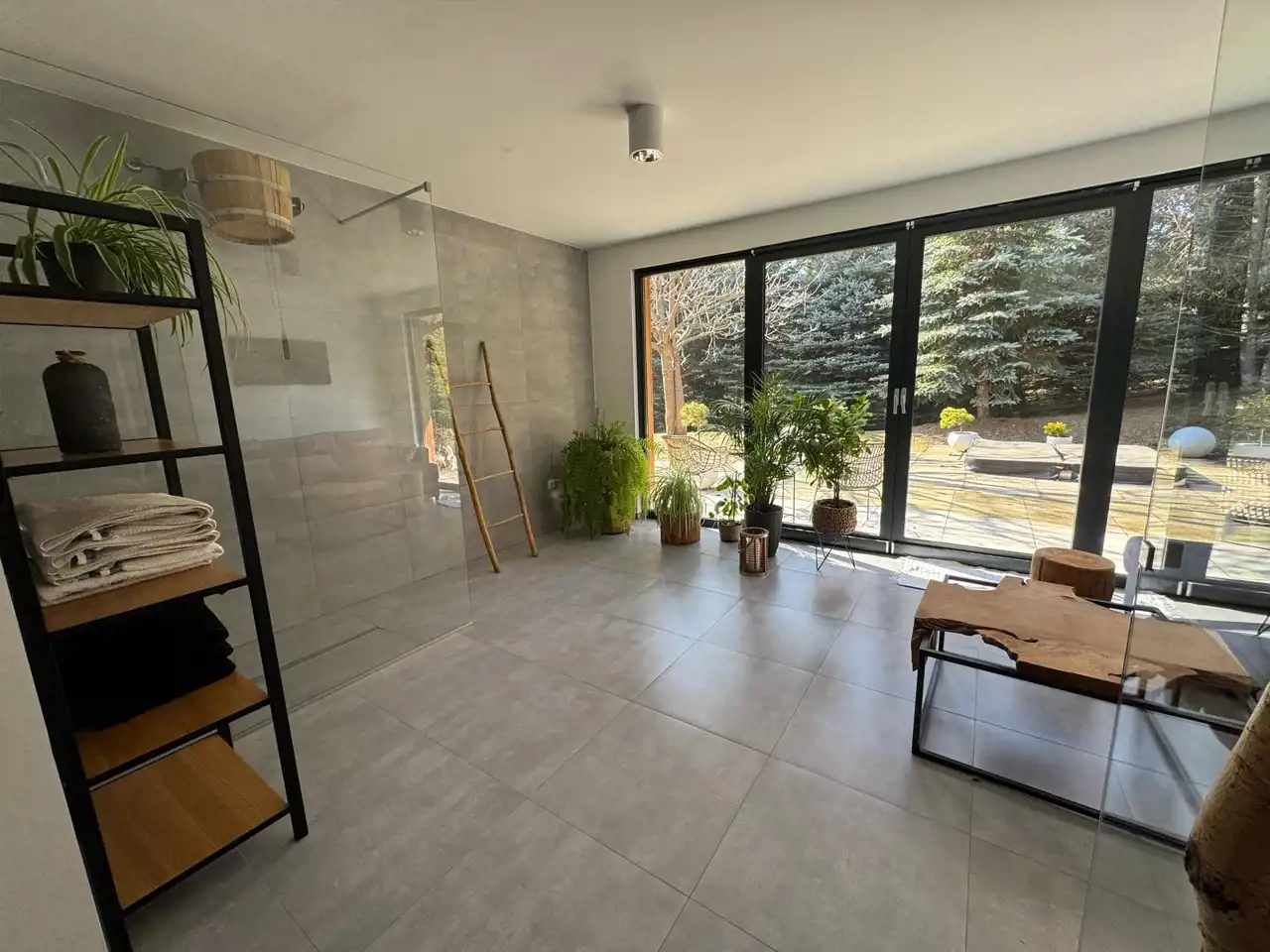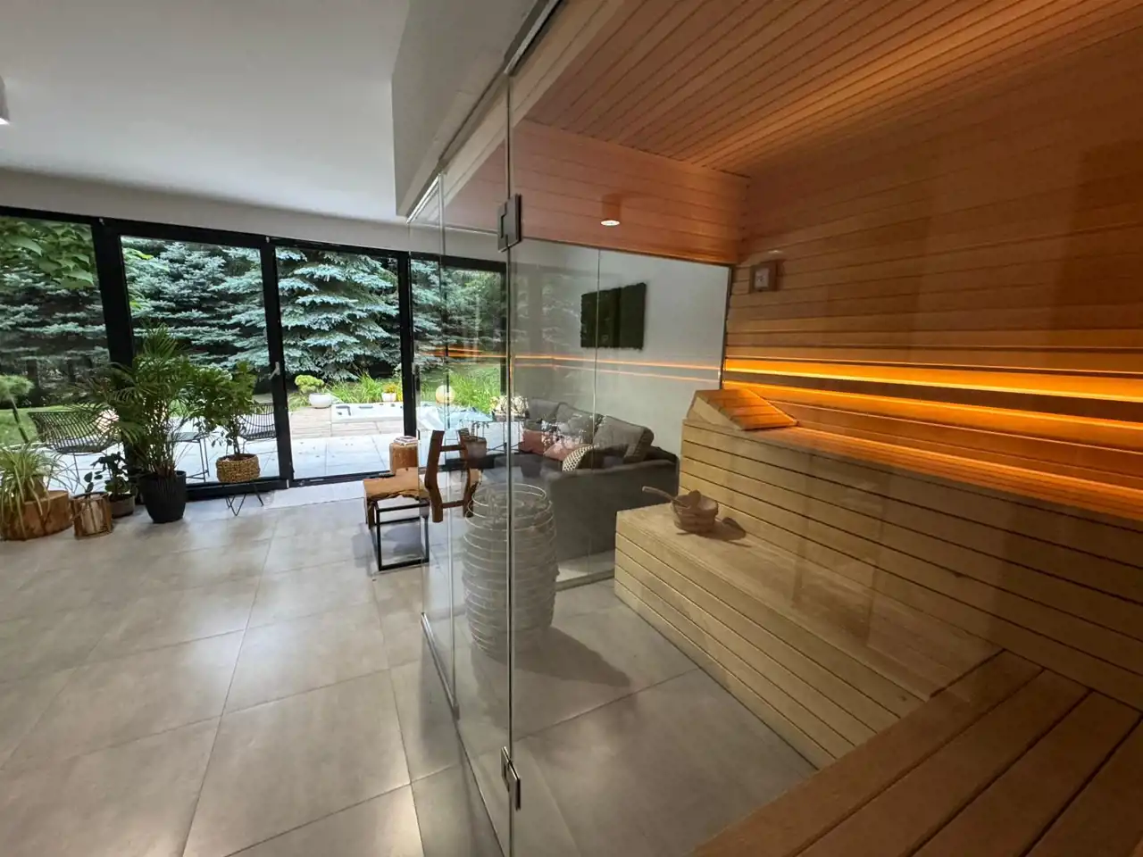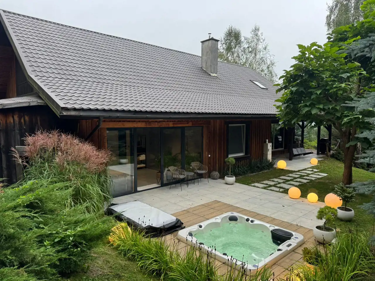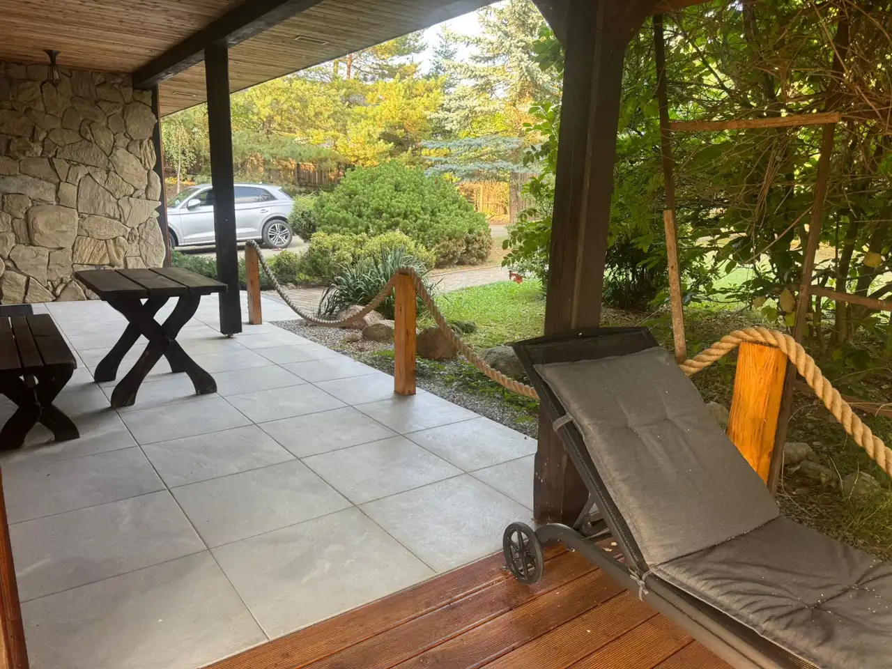 W części budynku, w którym znajduje się fińska sauna z prysznicem i fińskim wiadrem chłodzącym, jest również przestronna strefą relaksu z widokiem na ogród i wyjściem na tras w którym znajduje się jacuzzi.