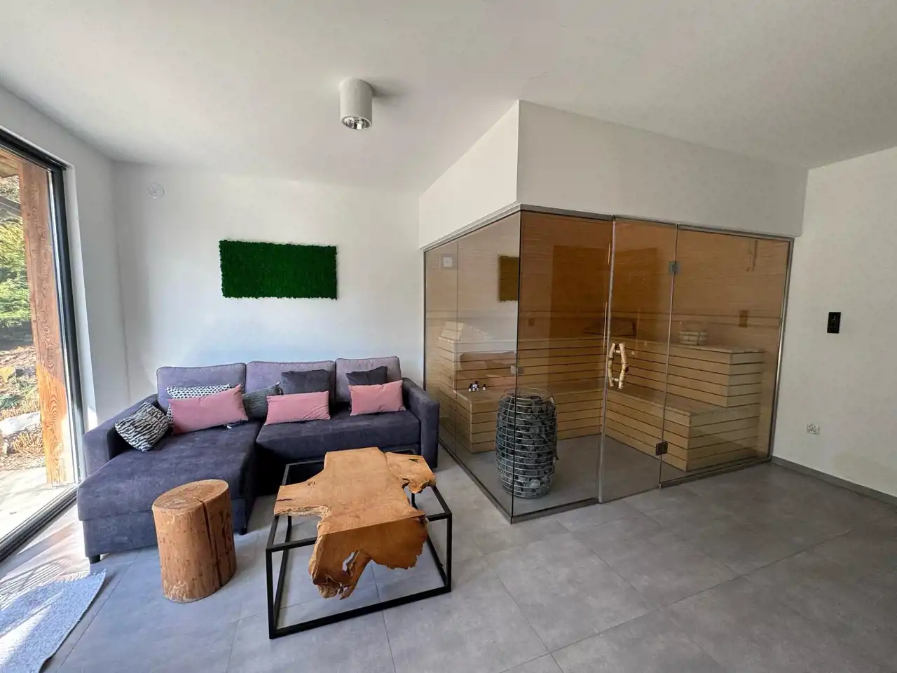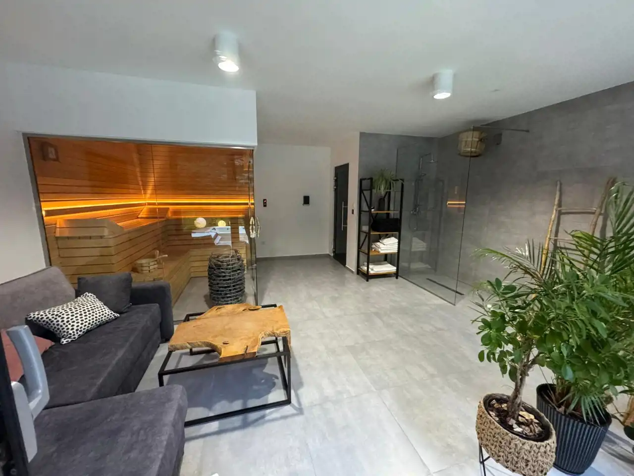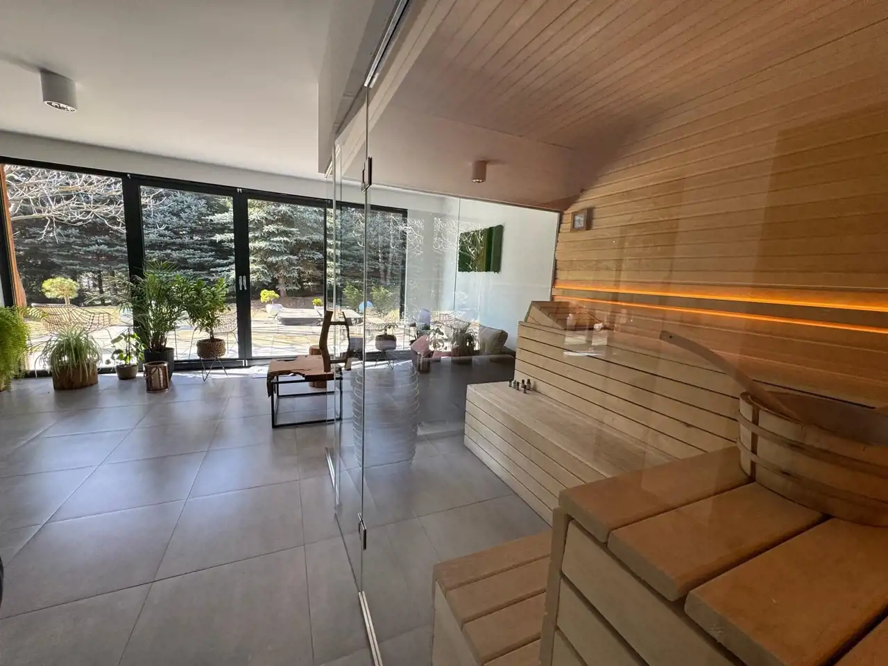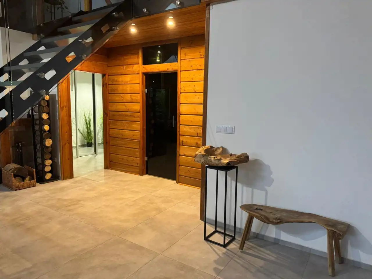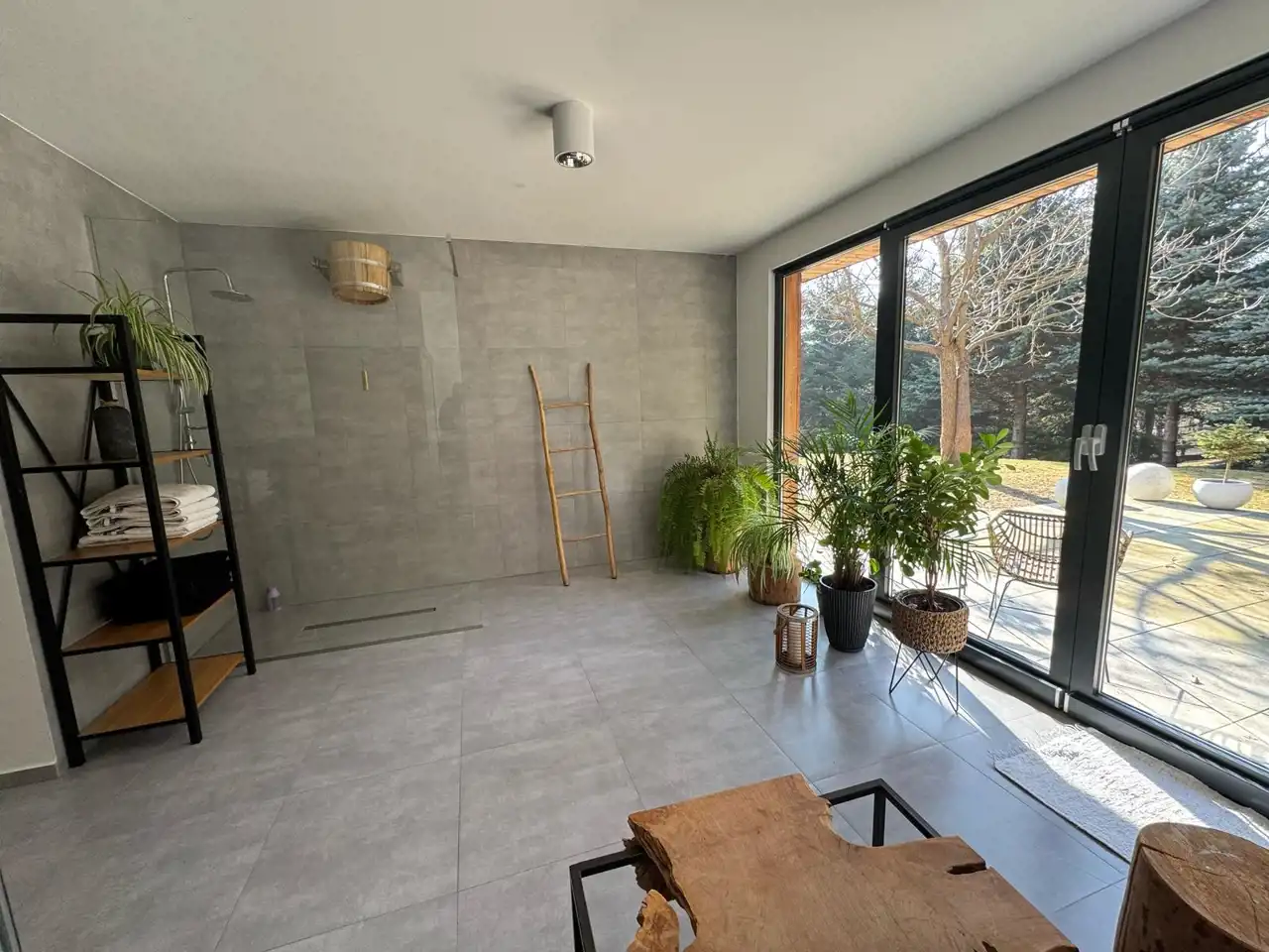 W części budynku, w którym znajduje się fińska sauna z prysznicem i fińskim wiadrem chłodzącym, jest również przestronna strefą relaksu z widokiem na ogród i wyjściem na tras w którym znajduje się jacuzzi.