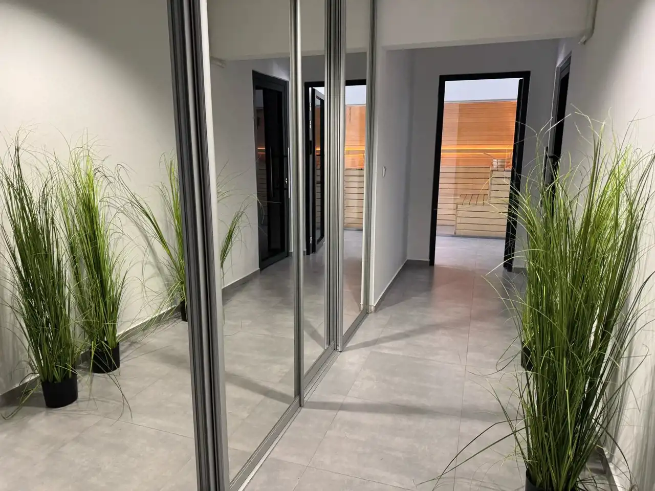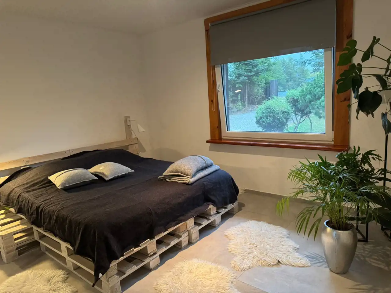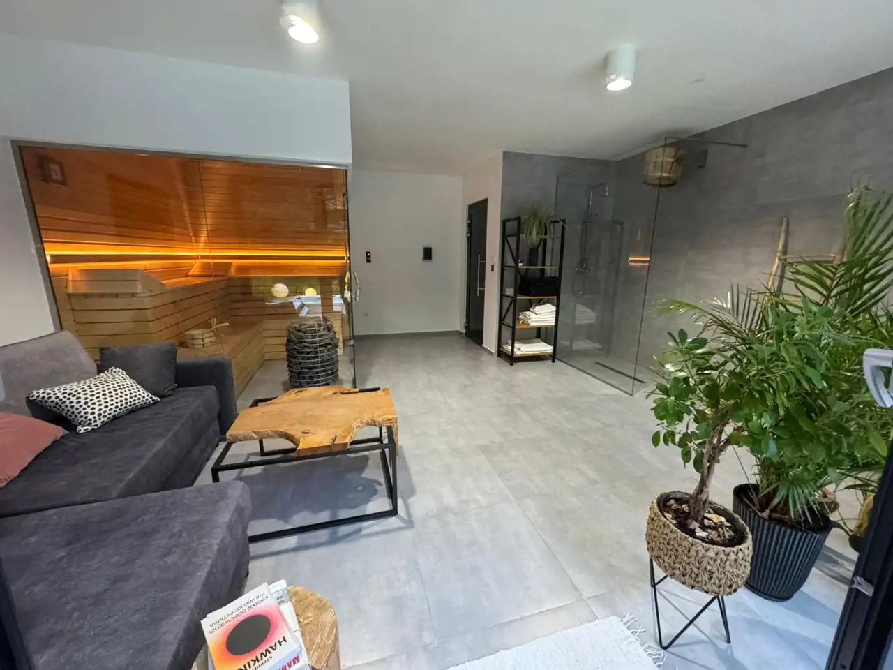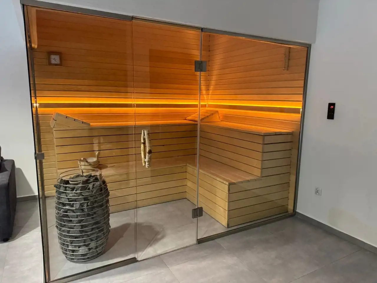 W części budynku, w którym znajduje się fińska sauna z prysznicem i fińskim wiadrem chłodzącym, jest również przestronna strefą relaksu z widokiem na ogród i wyjściem na tras w którym znajduje się jacuzzi.