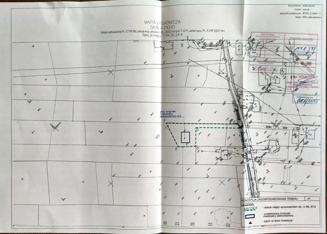 Planowany podział i umiejscowienie budynku pokazane na mapie zasadniczej w galerii oferty.