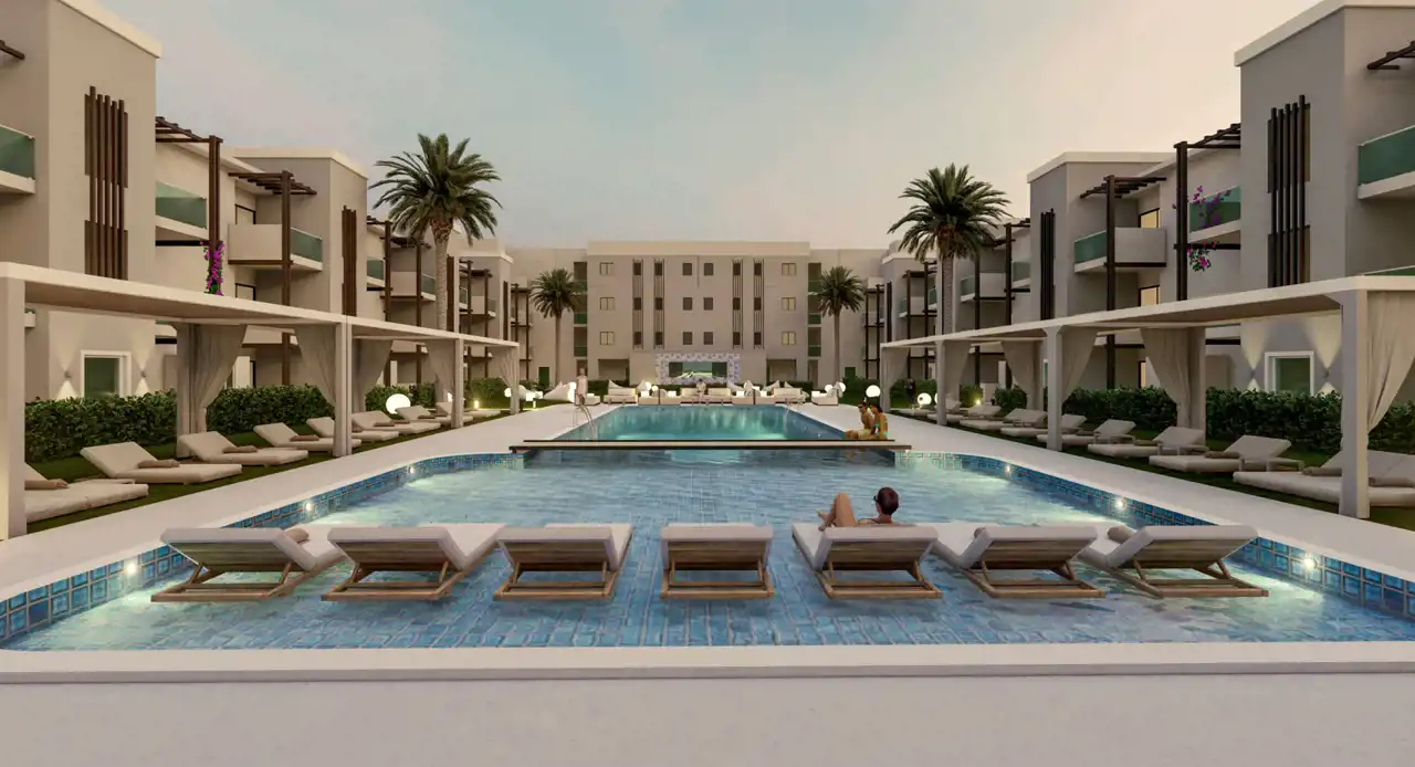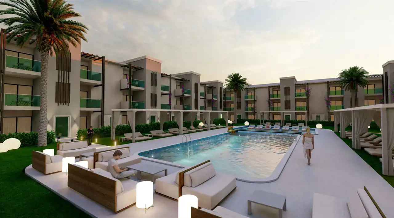Części wspólne tego projektu obejmują ogrody krajobrazowe, basen do dyspozycji 24h z miejscem do opalania, gdzie można cieszyć się chwilami relaksu dla siebie i swojej rodziny.