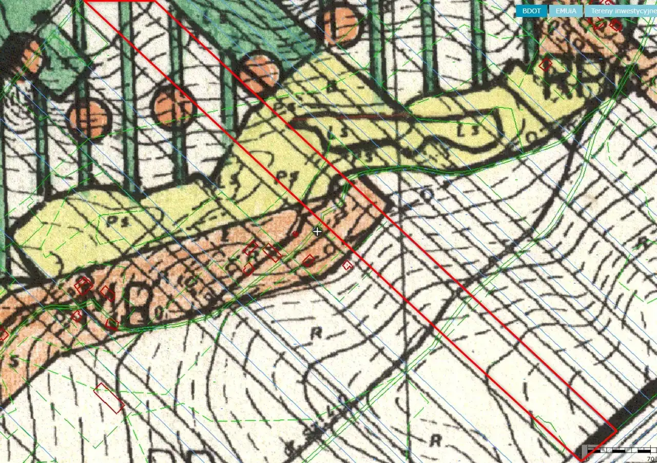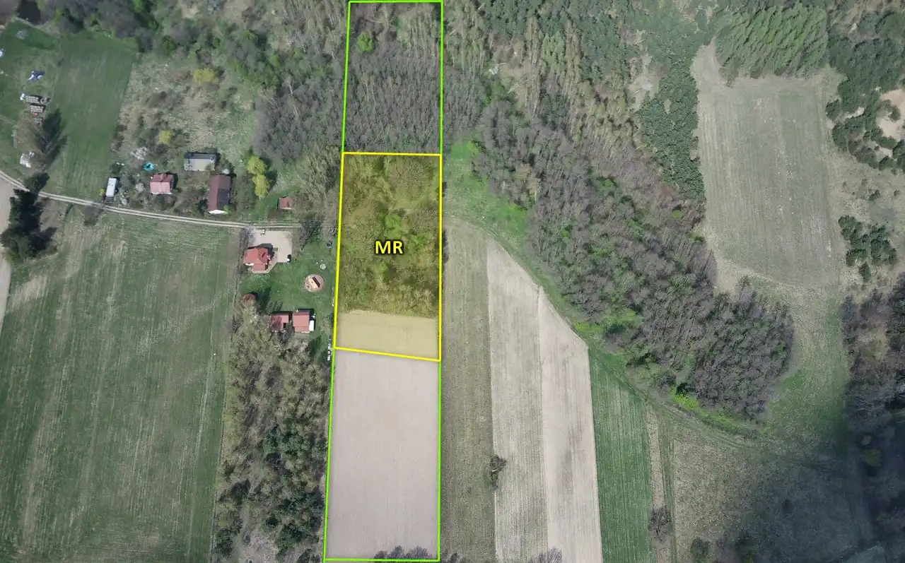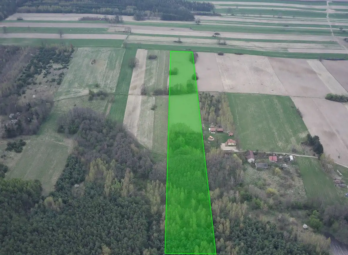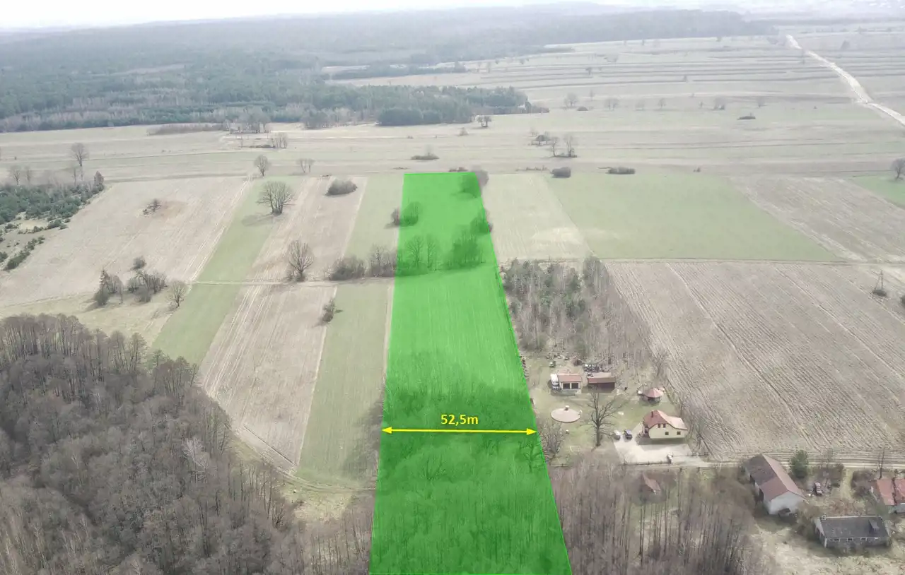 Wymiary nieruchomości to ok. 52,5m x 762m , o pow. 39 900 m2 z czego ok 7 000 m2 może być przeznaczone pod zabudowę.