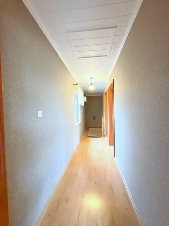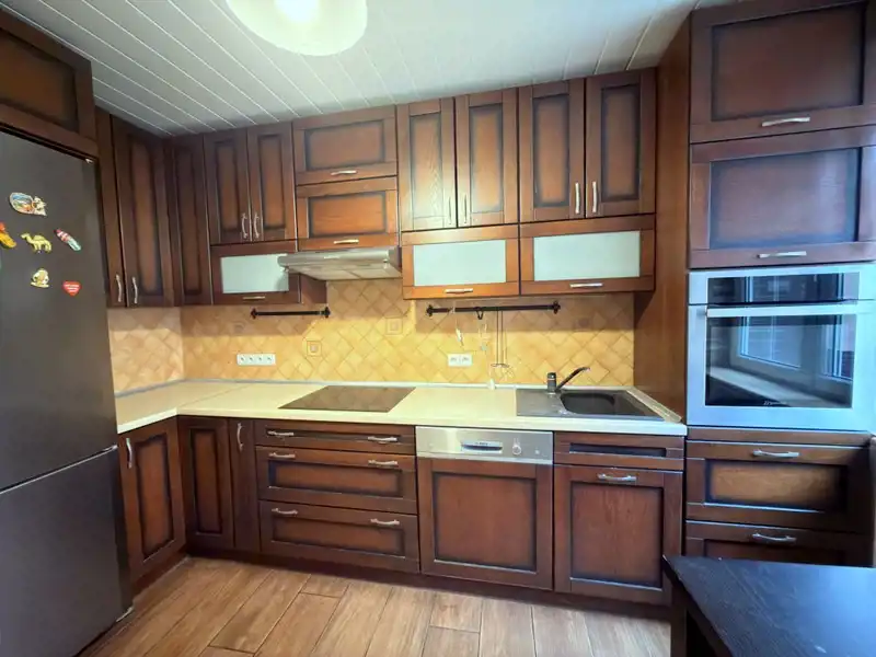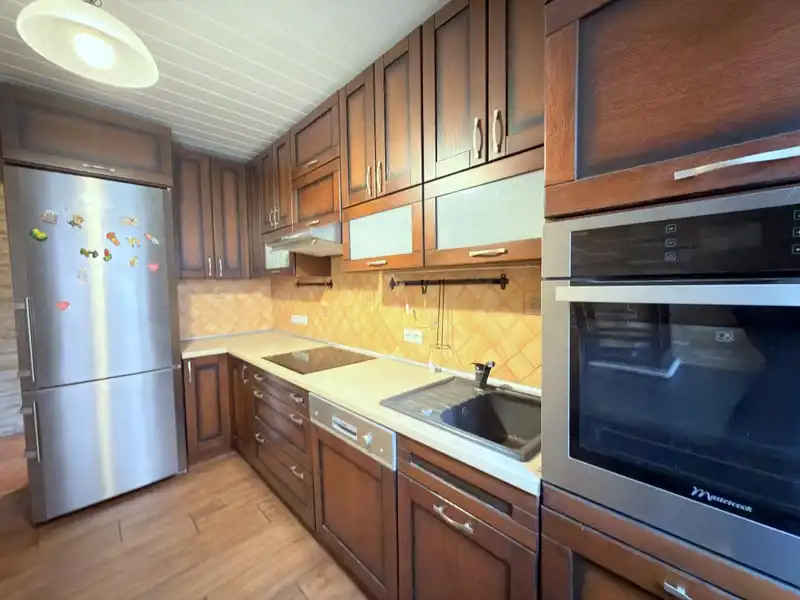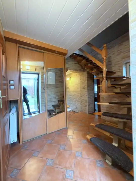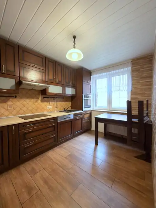 Parter: z salon, kuchnia z meblami drewnianymi na wymiar i sprzętem AGD; łazienka i toaleta;