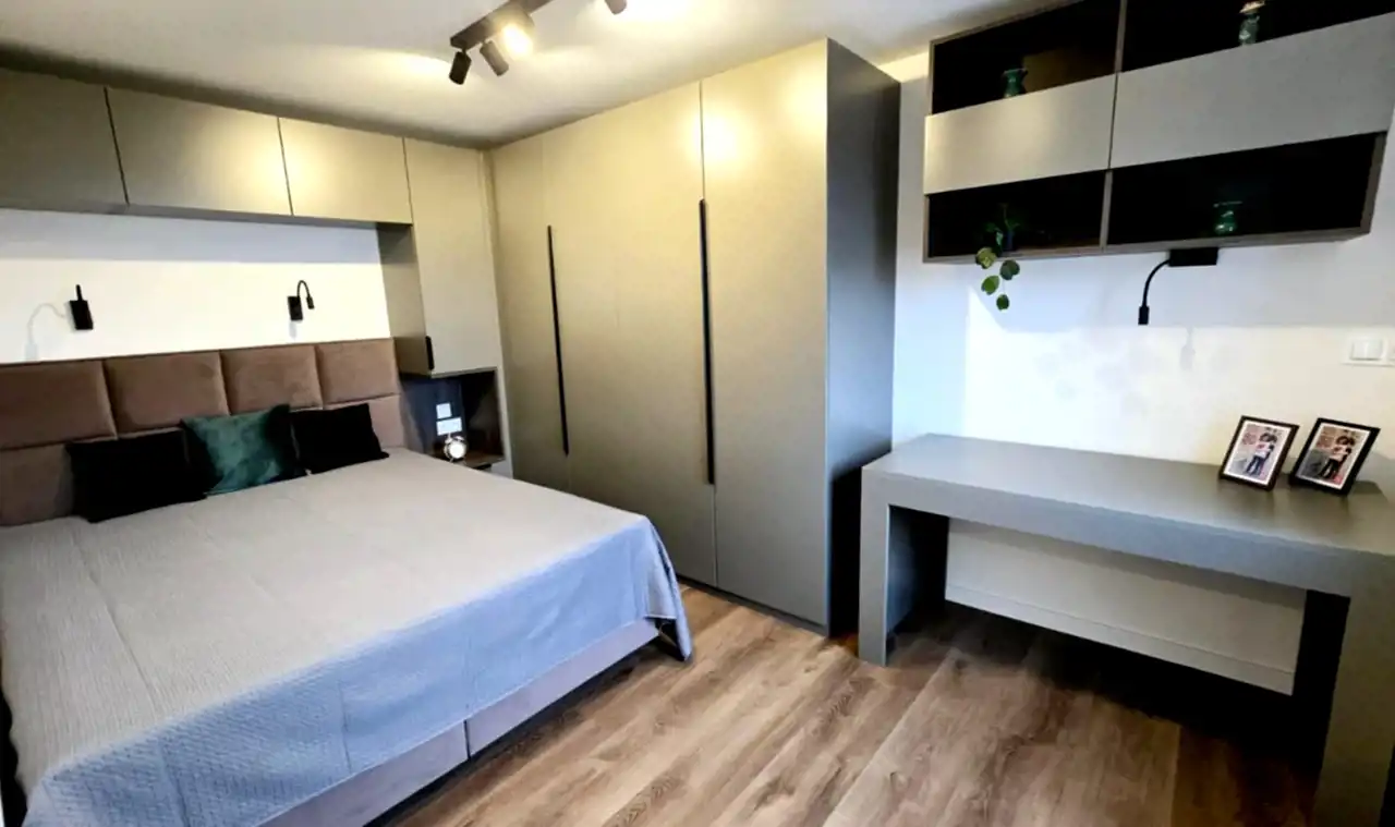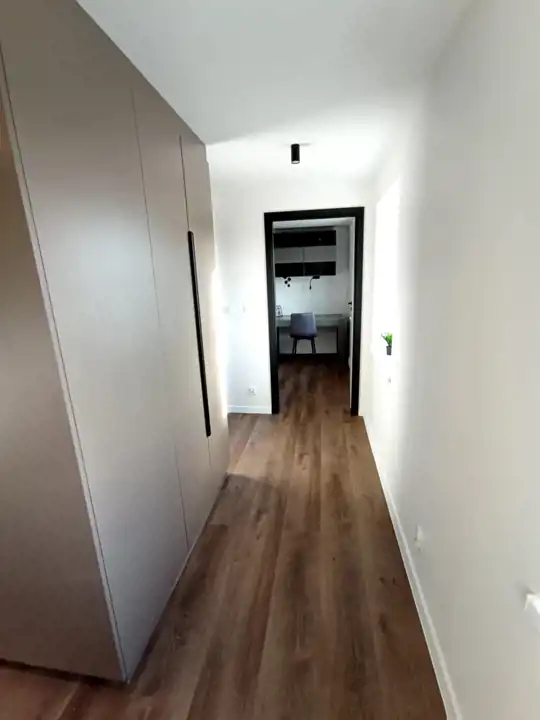 Obok jest jasny korytarz, łazienka z WC i gustowna sypialnia z pojemną szafą i wygospodarowanym miejscem do pracy - solidnym biurkiem.