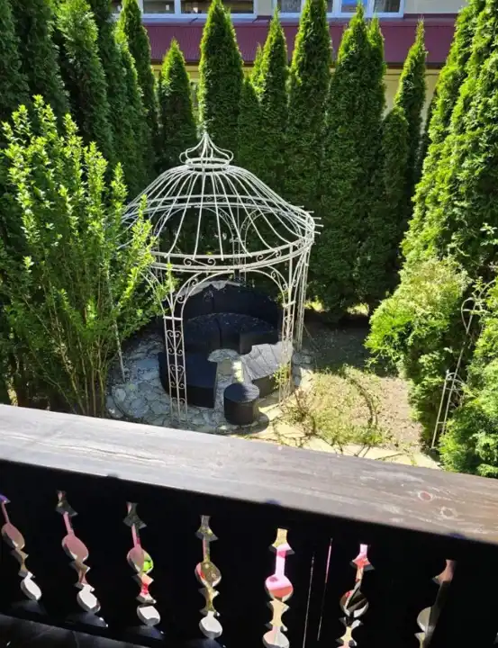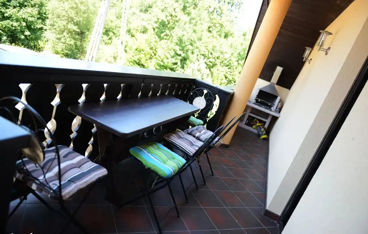 Posiada mały ogródek z placem zabaw dla dzieci i kompletem wypoczynkowym.