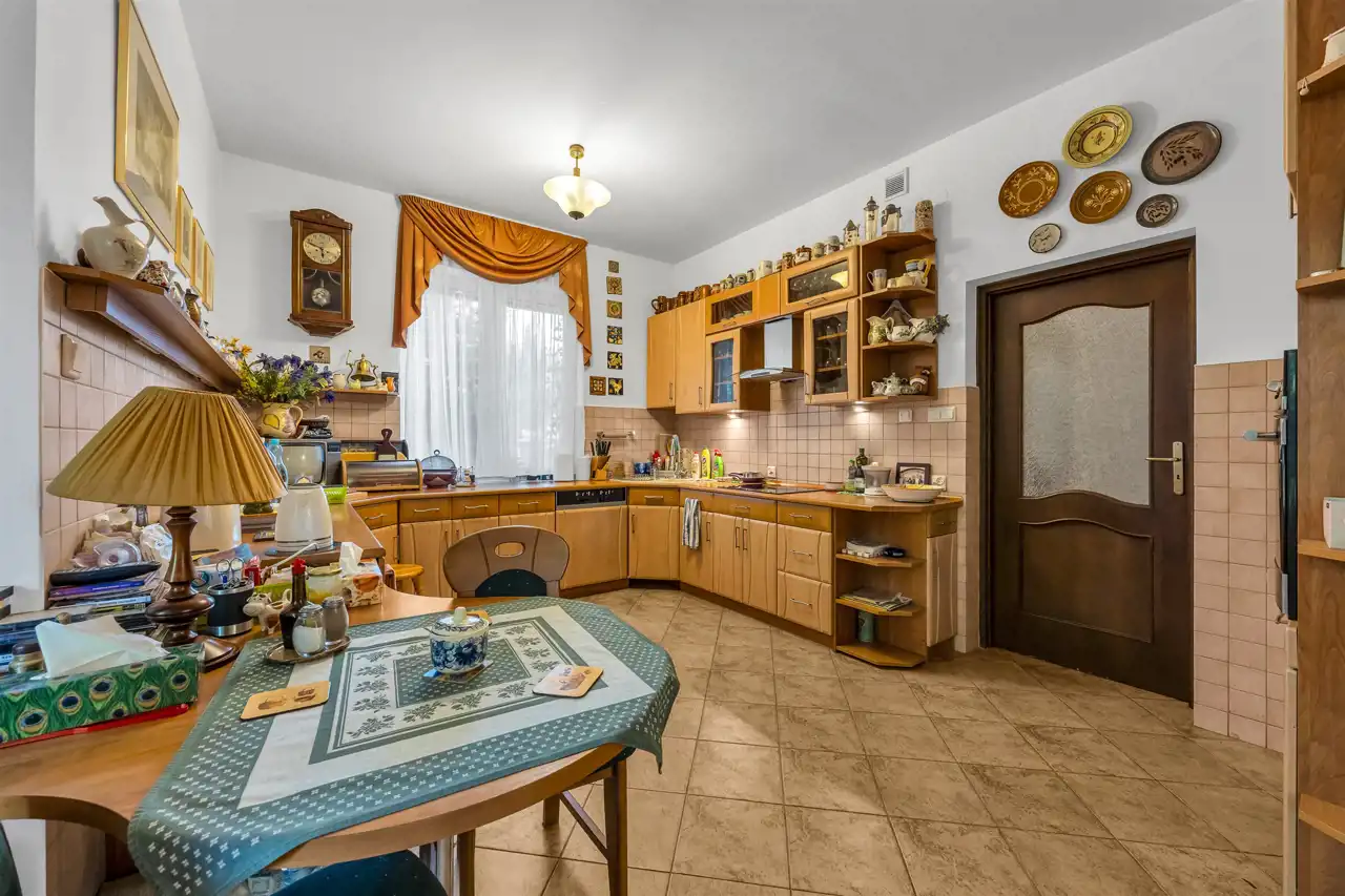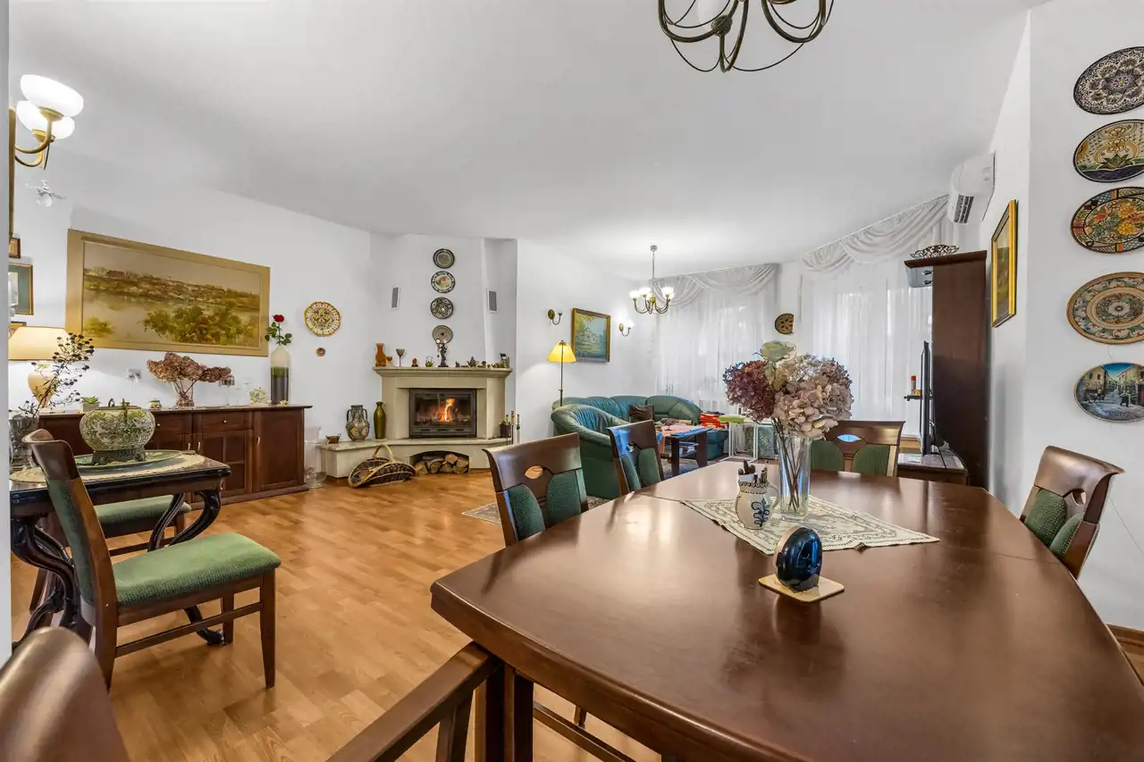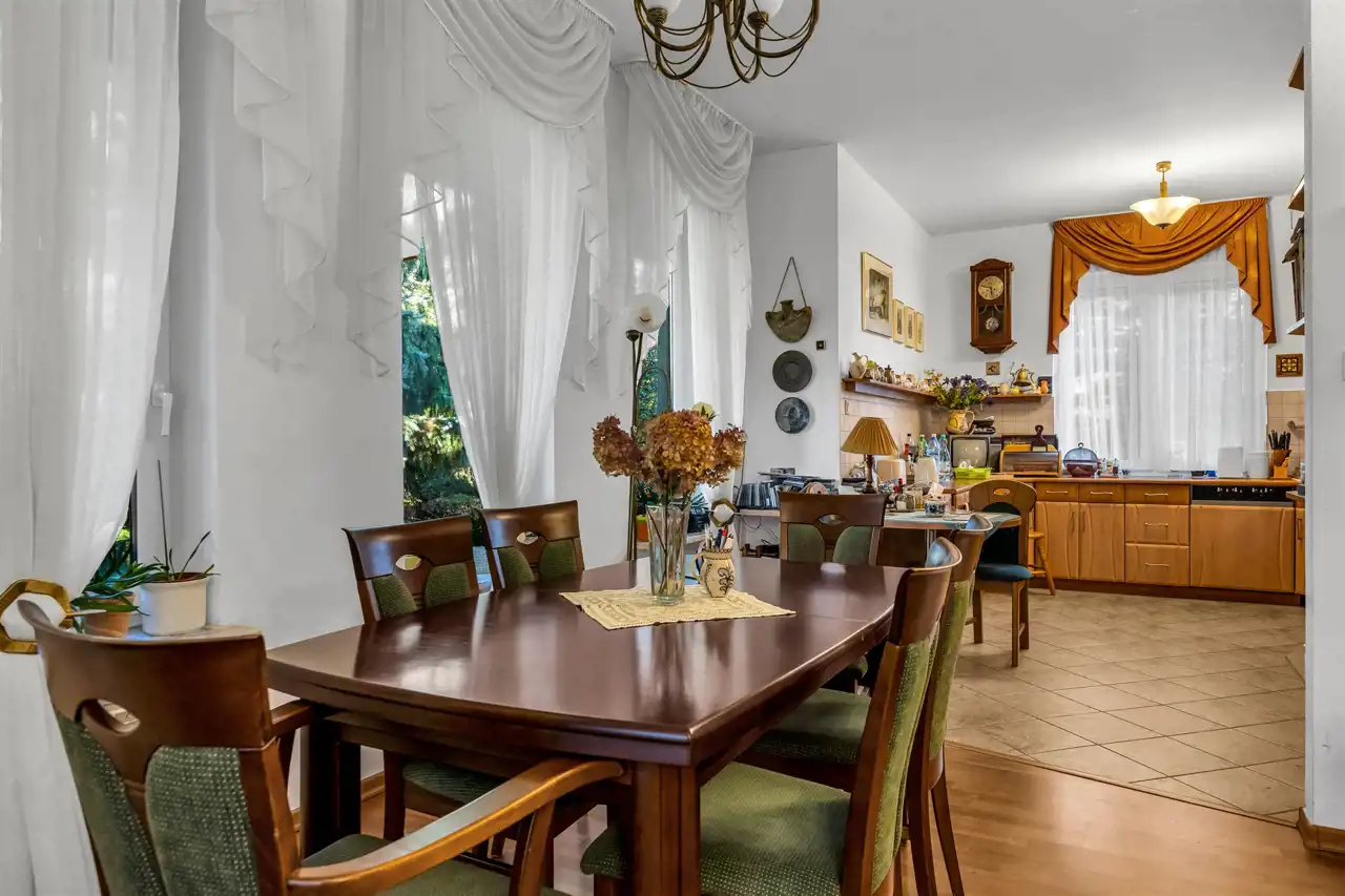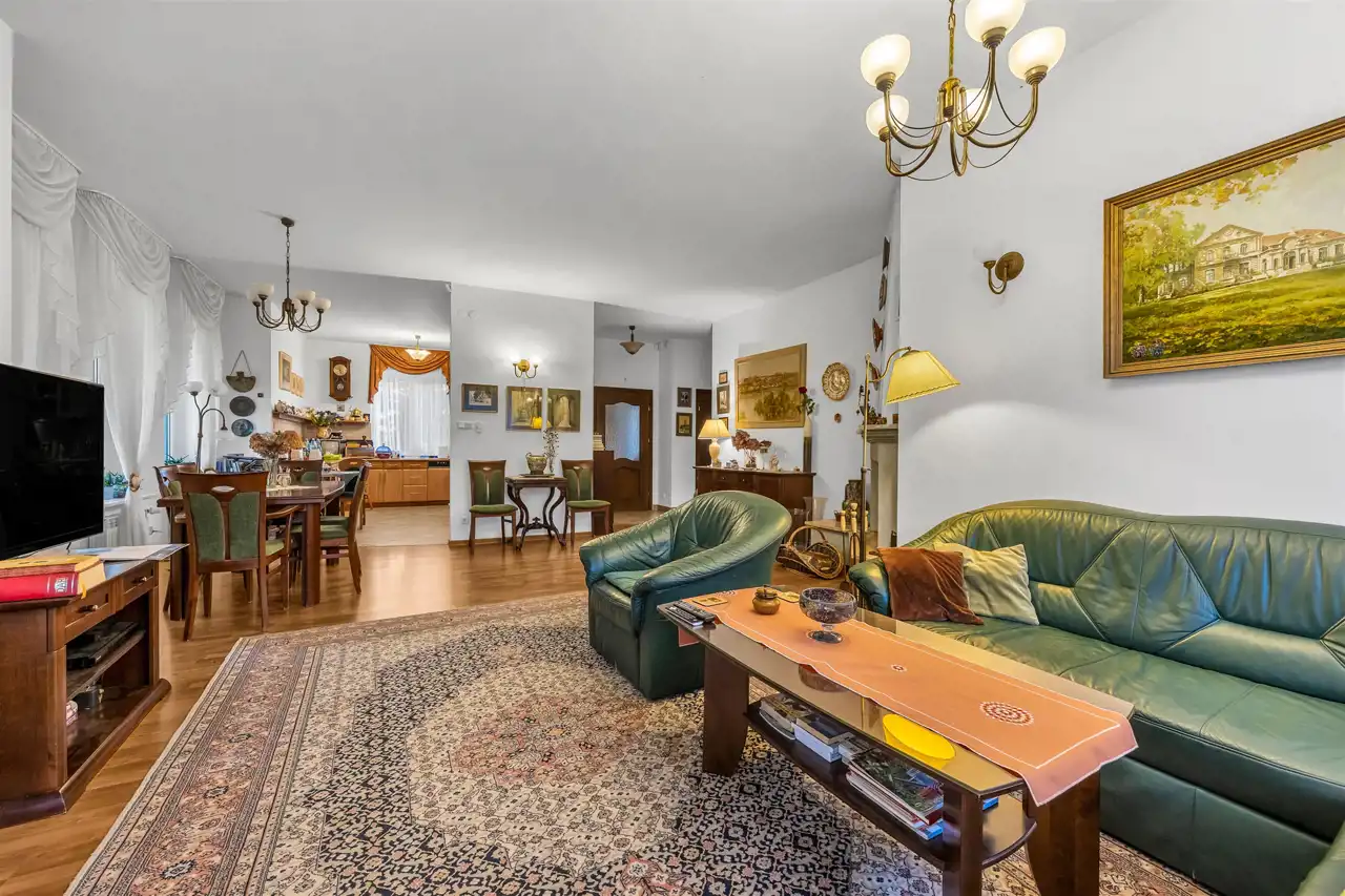 Stan domu, do wprowadzenia ewentualnego odświeżenia. Super układ pomieszczeń, dużo światła i przestrzeni. Prawie 40m salon z częściowo otwartą kuchnią oraz wyjściem na pięknie zagospodarowany taras, oraz bardzo dużą zagospodarowaną bajeczną wręcz roślinnością działkę. Piękne, duże okna, dzięki którym w domu jest dużo światła. Klimatyczny kominek dodający stylu i przytulności, który umili czas spędzany w salonie, a jednocześnie dodatkowo ogrzeje dom. W całym domu zainstalowana klimatyzacja, która zarówno schłodzi w ciepłe dni, jak też szybko dogrzeje dom po dłuższej nieobecności. Cztery pokoje/sypialnie które pomieszczą zarówno dużą rodzinę jak też w razie potrzeby gości.
