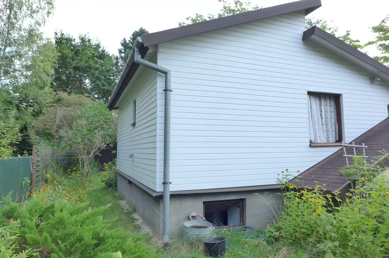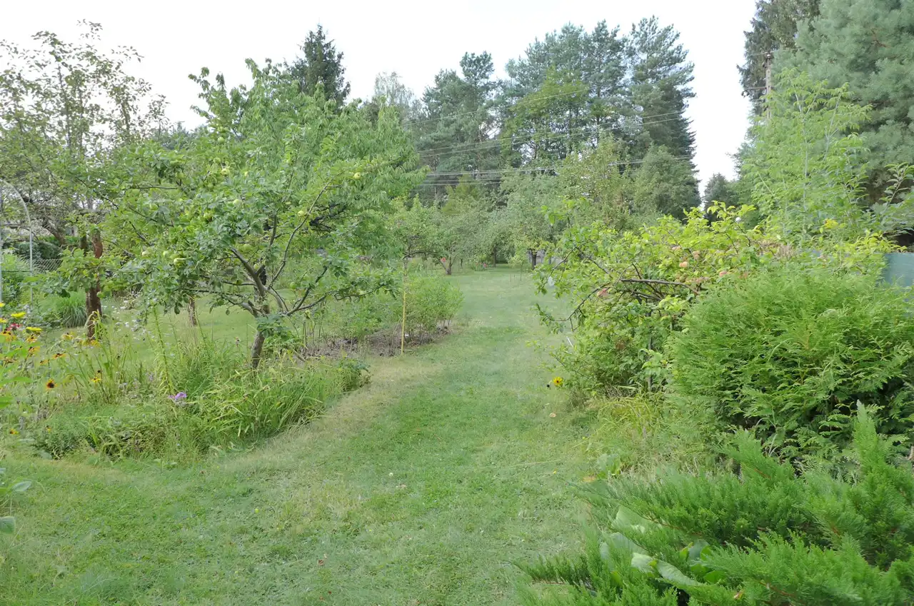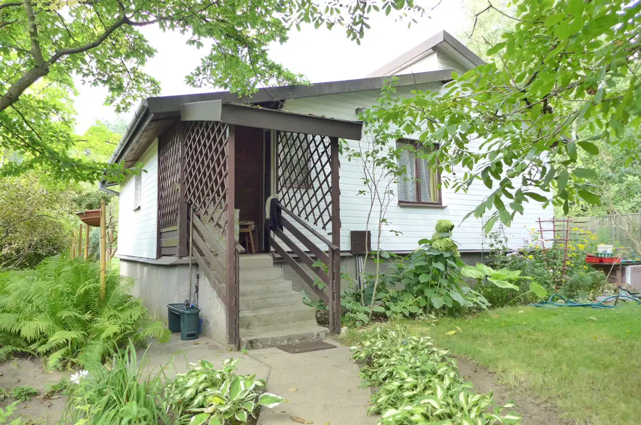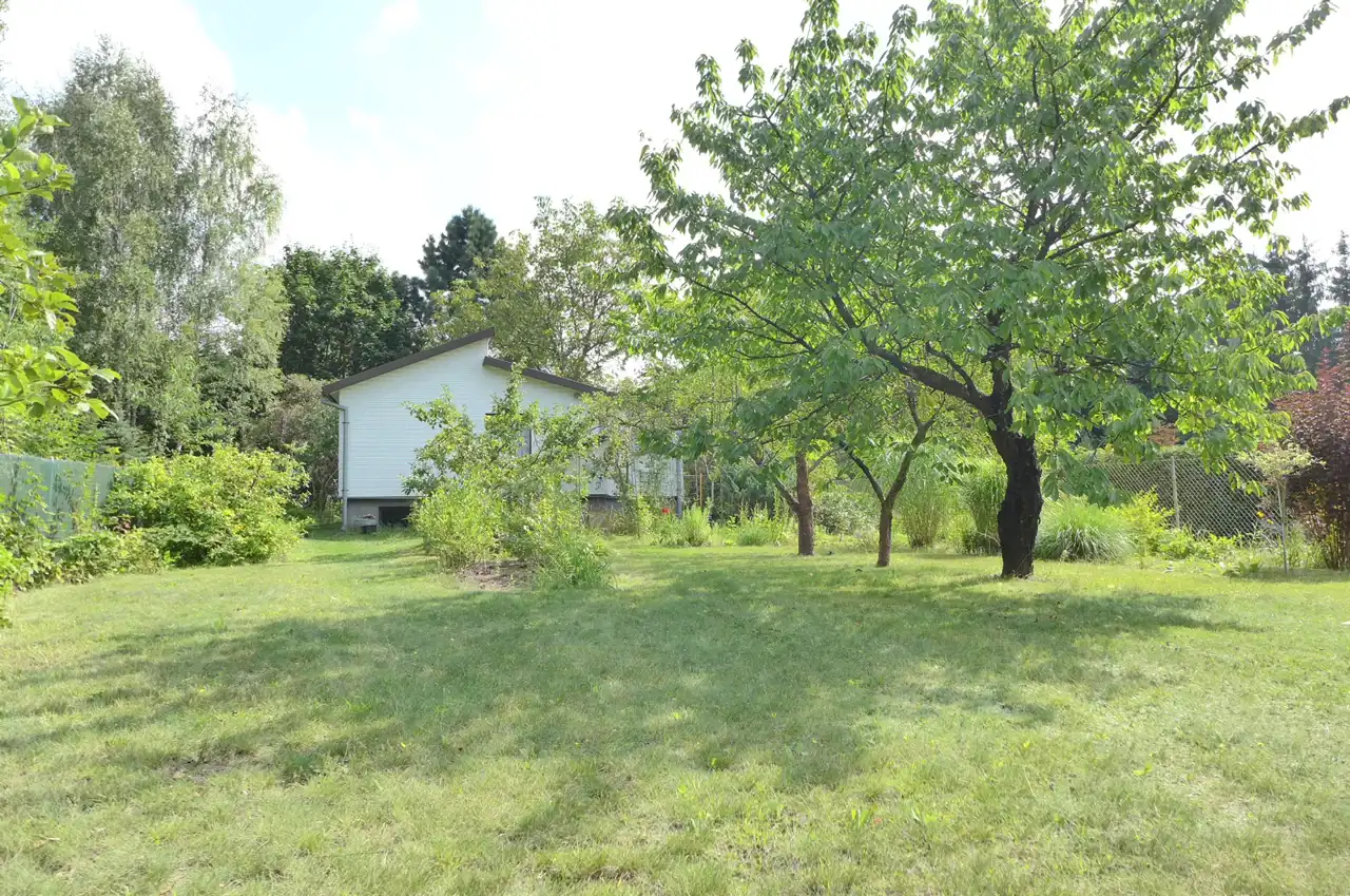 Działka płaska, zagospodarowana z licznymi nasadzeniami krzewów i drzew owocowych. Wymiary: 15m na 70m. Ogrodzona siatką z dwoma bramami wjazdowymi. Na działce stoi zadbany i dobrze utrzymany drewniany, ocieplony dom rekreacyjny z lat osiemdziesiątych. Powierzchnia domu to ok. 40 m2 na które składają się dwa pokoje i łazienka. Przestronna kuchnia powstała z adaptacji tarasu. Dom jest w całości podpiwniczony. Na terenie znajduje się również pomieszczenie gospodarcze i garaż z kanałem.