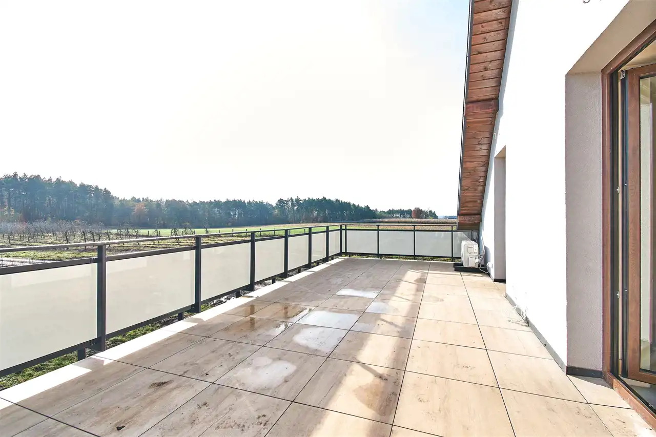 - taras na piętrze wykończony barierkami ze szkłem i płytami ceramicznymi na podstawkach,
