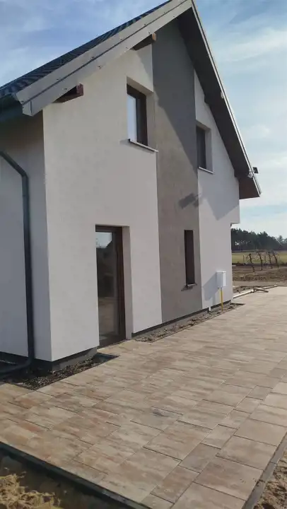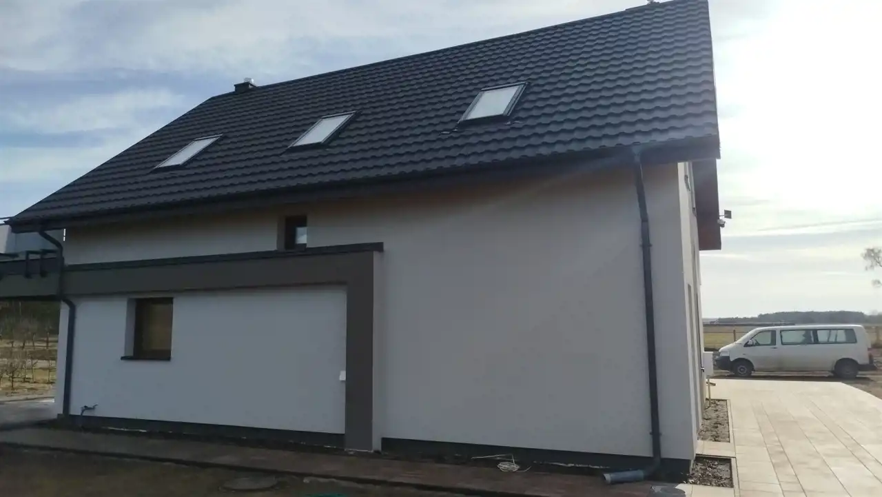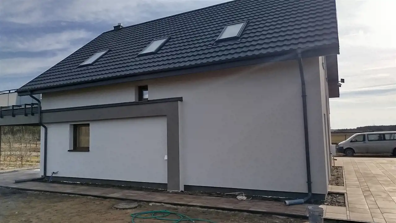 Dom zbudowany z gazobetony Ytong z 20 cm ociepleniem styropianem i wykonaną elewacją